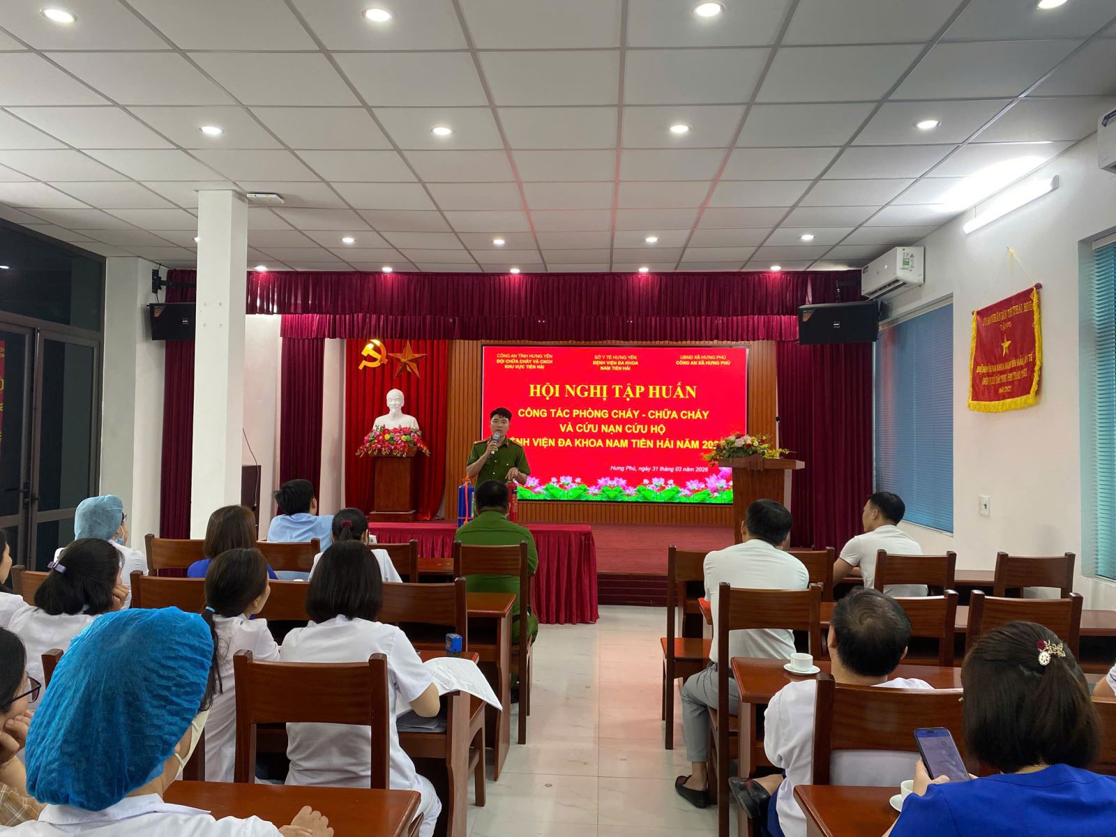 Tham dự hội nghị có đồng chí Lê Sinh – Giám đốc Bệnh viện Nam Tiền Hải; đại biểu Hội đồng nhân dân xã; các đồng chí chuyên viên phòng Cảnh sát PCCC&CNCH, Công an tỉnh Hưng Yên; cán bộ Công an xã Hưng Phú; cùng tập thể lãnh đạo, cán bộ, công nhân viên các khoa, phòng chuyên môn của bệnh viện.