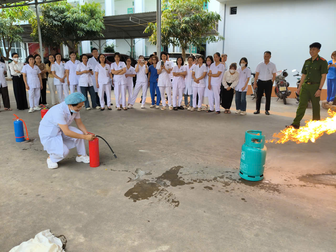 Bên cạnh nội dung lý thuyết, các đại biểu còn được trực tiếp thực hành sử dụng các loại bình chữa cháy như bình bọt, bình khí; được hướng dẫn thao tác xử lý tình huống cháy, nổ trong thực tế. Qua đó, giúp nắm vững các biện pháp bảo đảm an toàn PCCC và CNCH, đồng thời nhận diện các khu vực có nguy cơ cháy nổ cao trong bệnh viện như hệ thống điện, phòng mổ, khu xét nghiệm hóa chất, kho dược – vật tư y tế, bếp ăn, bãi để xe và các khu vực tập trung đông người.