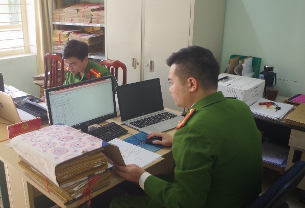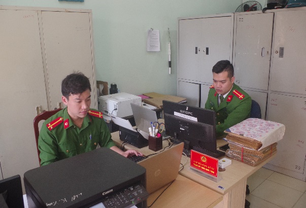 Cán bộ chiến sỹ Công an xã Lê Lợi tập trung thực hiện công tác cập nhật, bổ sung dữ liệu đăng ký, quản lý phương tiện