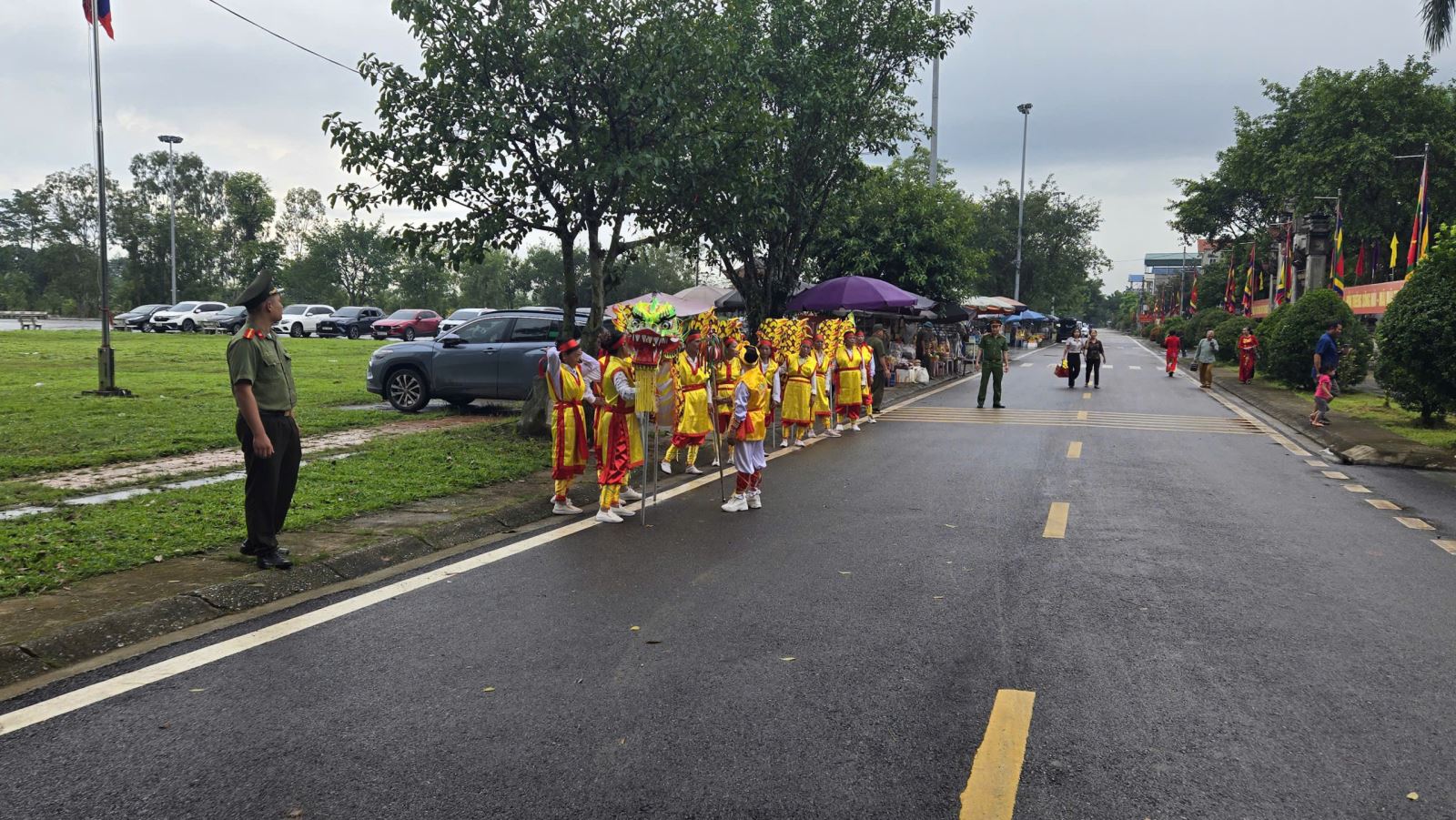 Trong thời gian tổ chức lễ, lực lượng Công an xã đã bố trí các chốt trực, tổ tuần tra kiểm soát tại khu vực Đền, bãi gửi xe và các tuyến đường chính; phối hợp với các lực lượng chức năng phân luồng giao thông, hướng dẫn nhân dân và du khách, không để xảy ra ùn tắc hay mất an ninh trật tự.