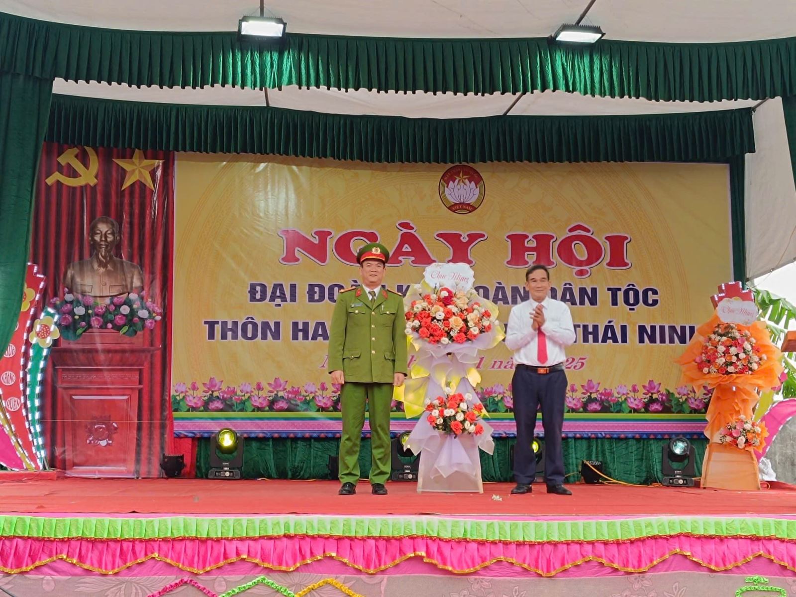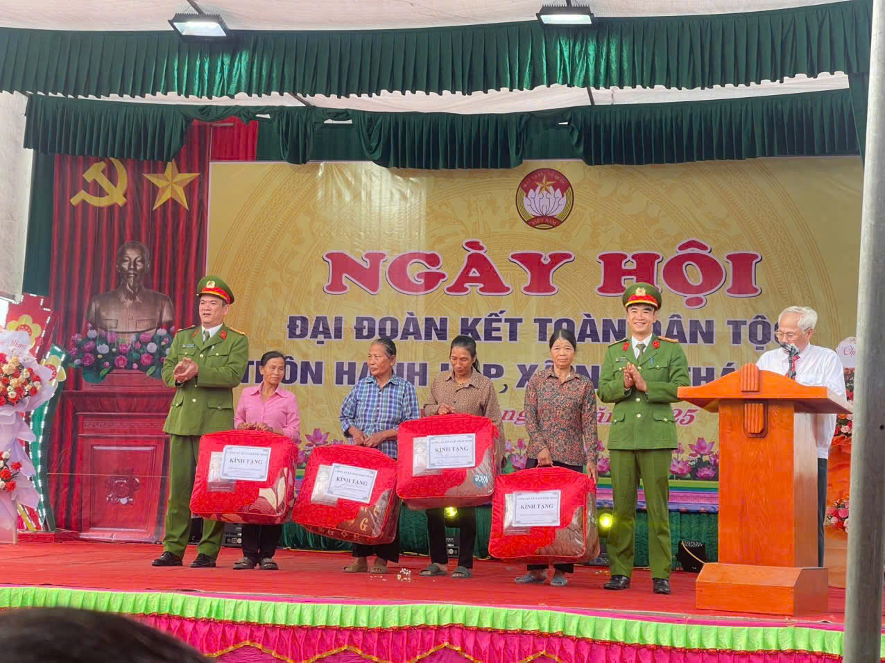 Chỉ huy Công an xã tặng hoa chúc mừng ngày hội và trao tặng quà cho nhân dân