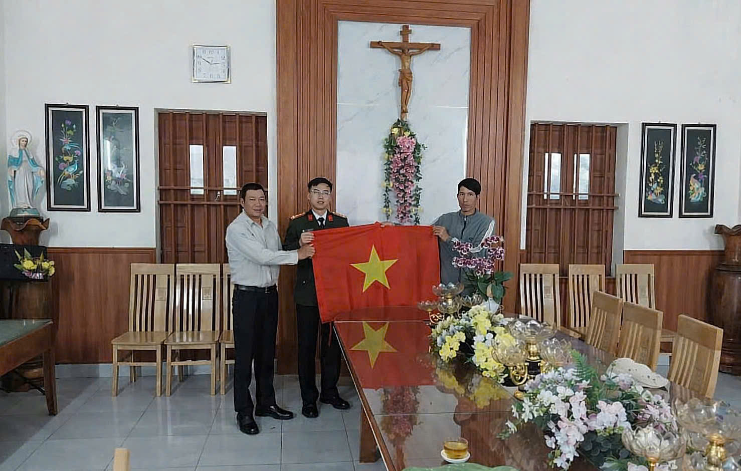Đại diện Công an xã thăm, trao tặng cờ Tổ quốc cho đại diện Giáo xứ Khúc Mai