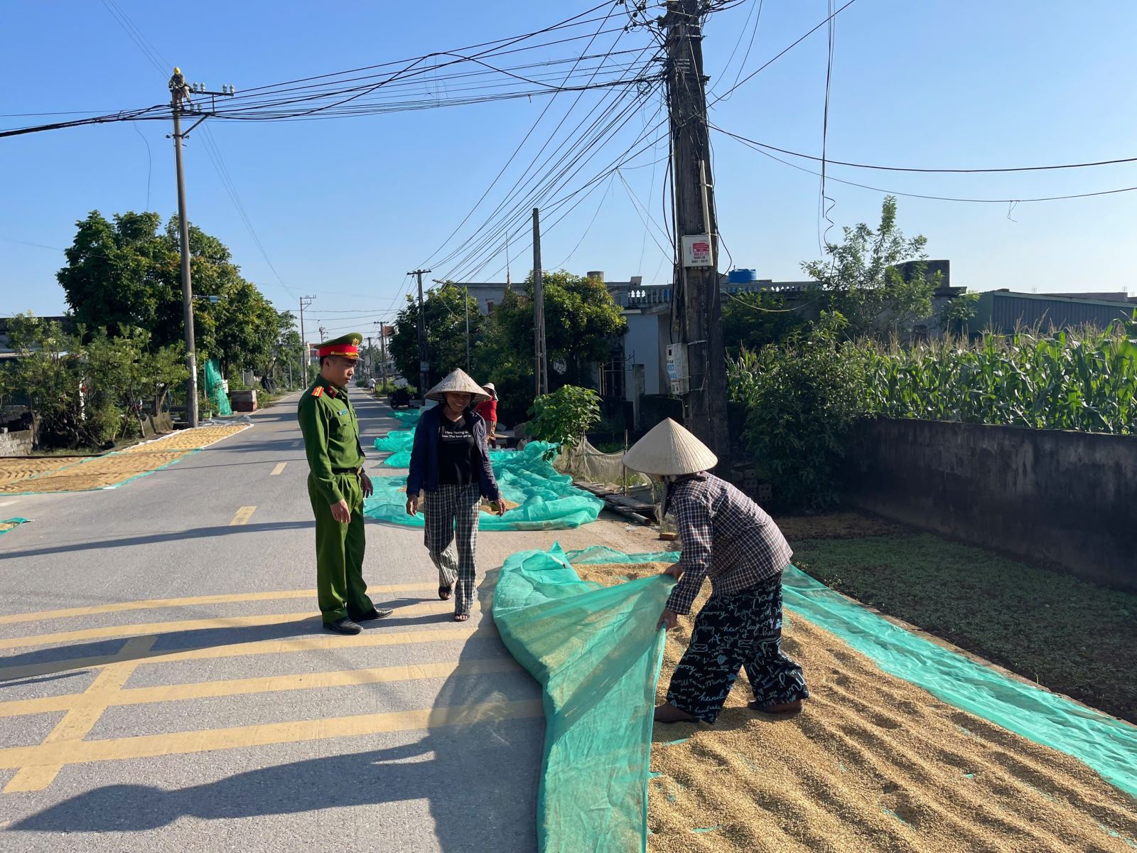 Lực lượng Công an xã nhắc nhở bà con nhân dân không phơi nông sản trên lòng, lề đường giao thông