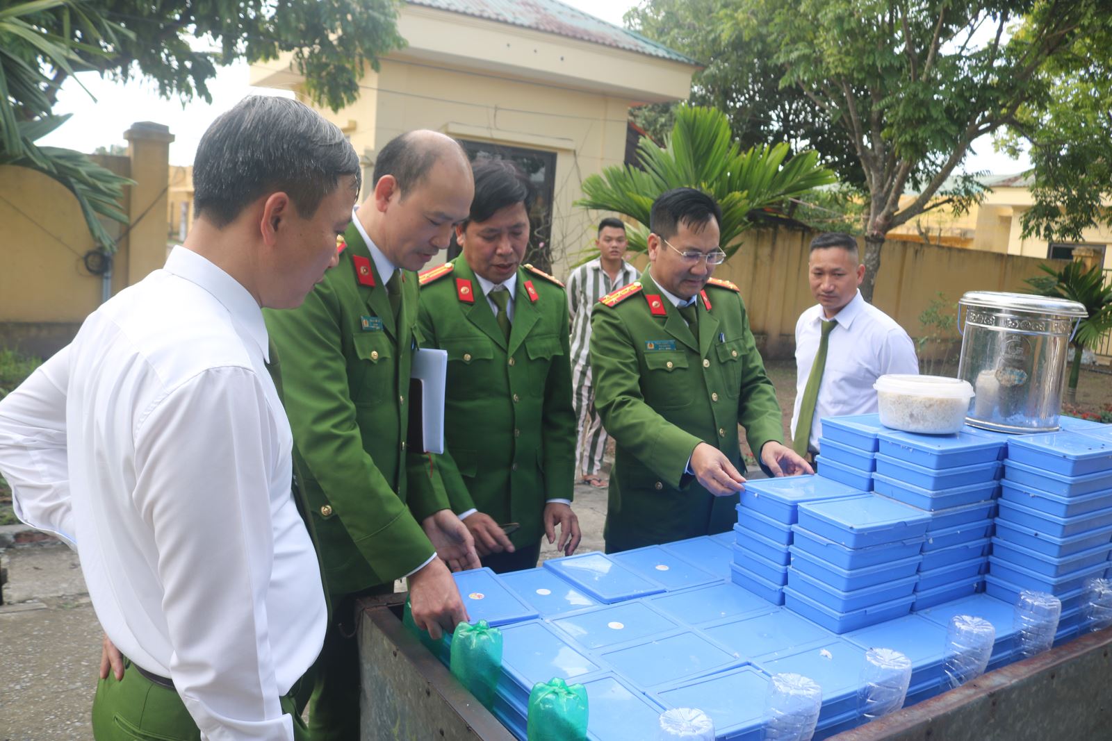 Đại diện Chi uỷ, Chỉ huy, Đoàn Thanh niên, Chi hội phụ nữ Công an xã Nam Tiên Hưng trao quà cho trẻ mồ côi được nuôi dưỡng tại Chùa Trình Lâm