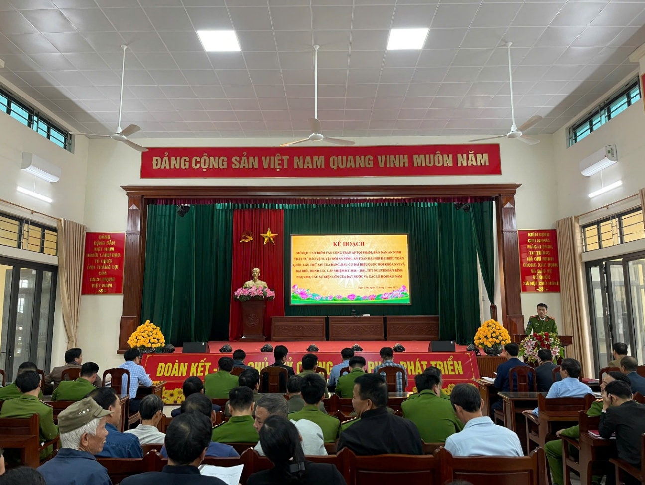Bắt đầu từ ngày 12/12/2025, Công an xã cùng lực lượng an ninh, trật tự ở cơ sở 26 thôn đồng loạt ra quân tấn công trấn áp tội phạm, bảo đảm ANTT trên địa bàn xã; tăng cường phòng ngừa, đấu tranh, trấn áp mạnh, xử lý nghiêm các loại tội phạm, vi phạm pháp luật; Triển khai đồng bộ các biện pháp, nhất là công tác nghiệp vụ cơ bản để làm tốt công tác phòng ngừa, đấu tranh có hiệu quả các loại tội phạm; Tổng kiểm tra, kiểm soát hành chính ban đêm; Tập trung kiểm soát, phát hiện, thống kê, quản lý người nghiện ma túy, người sử dụng trái phép các chất ma túy; Đẩy mạnh phát hiện đấu tranh với các tội phạm kinh tế, tham nhũng, lãng phí.