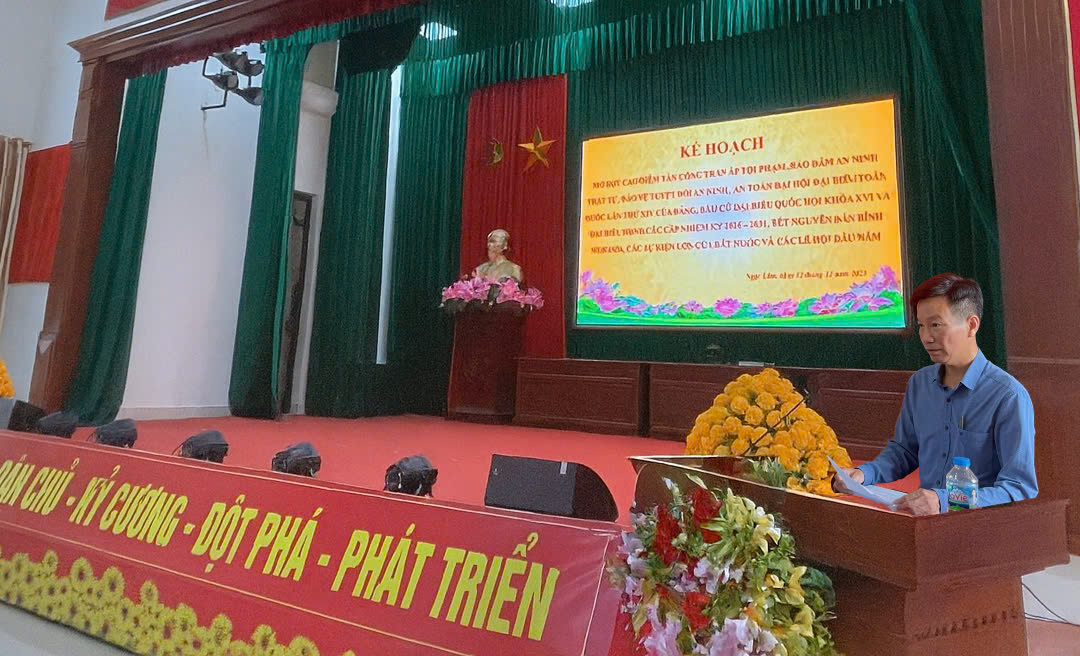 Phát biểu tại lễ ra quân, đồng chí Nguyễn Văn Trọng - Bí thư Đảng ủy, Chủ tịch HĐND xã nhấn mạnh: Đợt cao điểm tấn công trấn áp tội phạm bảo vệ ANTT lần này có ý nghĩa rất quan trọng; là dịp chuẩn bị diễn ra nhiều sự kiện trọng đại của Đảng, Tết Nguyên đán... sẽ góp phần phòng ngừa đấu tranh ngăn chặn có hiệu quả với các loại tội phạm, tệ nạn xã hội, giữ vững ổn định về ANTT.