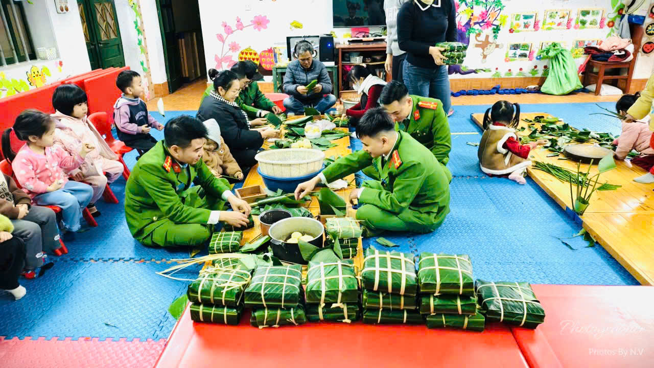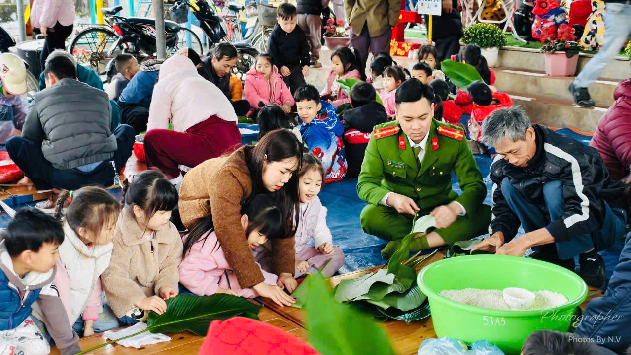 Tại chương trình, các em học sinh được tham gia hoạt động trải nghiệm gói bánh chưng – nét đẹp văn hóa truyền thống của dân tộc mỗi dịp Tết đến, Xuân về. Dưới sự hướng dẫn của giáo viên và cán bộ, chiến sĩ Công an xã, các em được tìm hiểu ý nghĩa của bánh chưng trong ngày Tết cổ truyền, trực tiếp tham gia các công đoạn như xếp lá dong, cho gạo nếp, đỗ xanh, thịt vào khuôn, buộc lạt… Hoạt động không chỉ mang lại niềm vui mà còn góp phần giáo dục truyền thống, bồi dưỡng tình yêu quê hương, đất nước cho các em ngay từ lứa tuổi mầm non.
