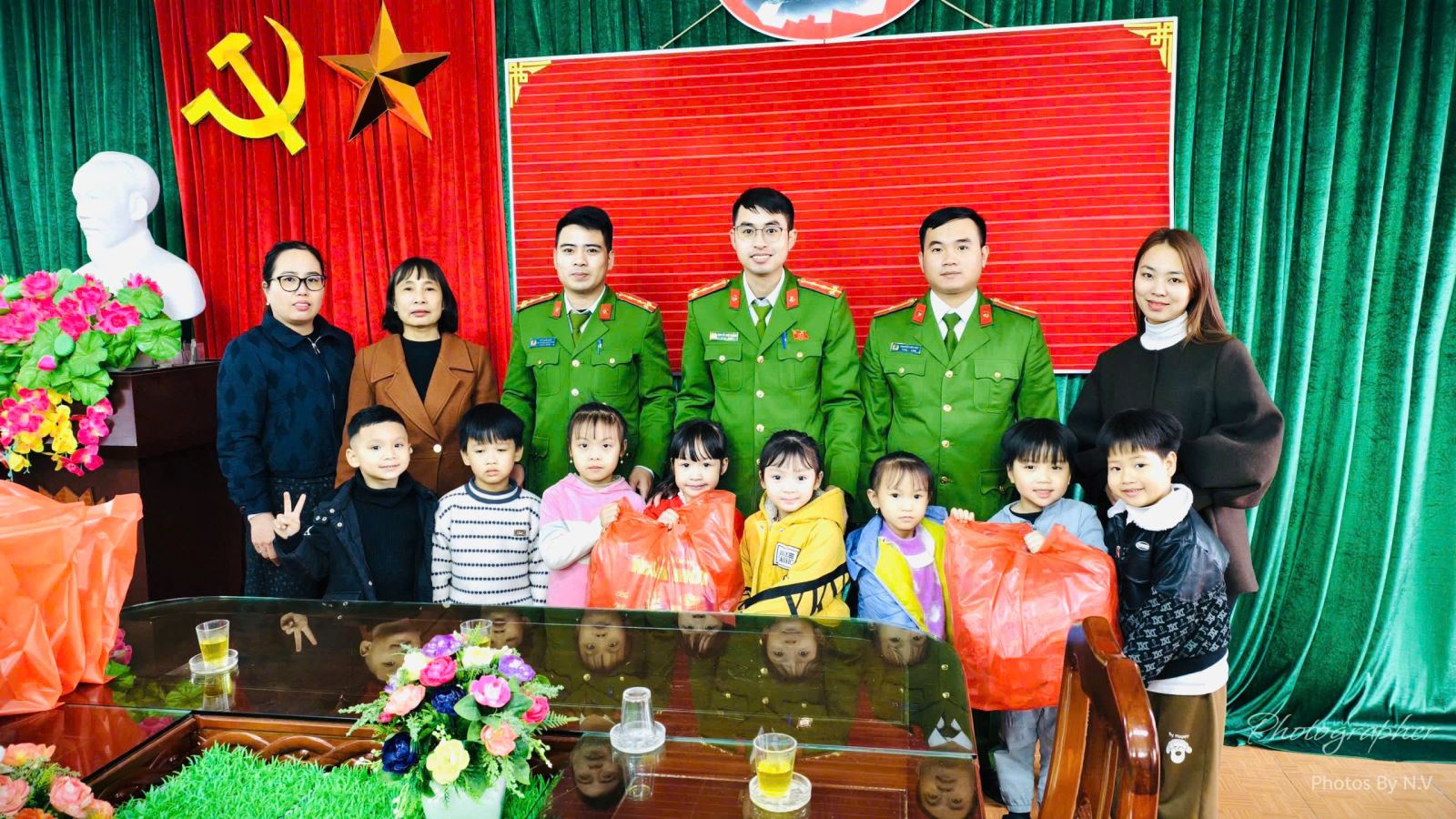 Công an xã Nguyễn Du chụp ảnh lưu niệm và trao những phần quà Tết ý nghĩa cho các em học sinh Trường Mầm non Quỳnh Nguyên