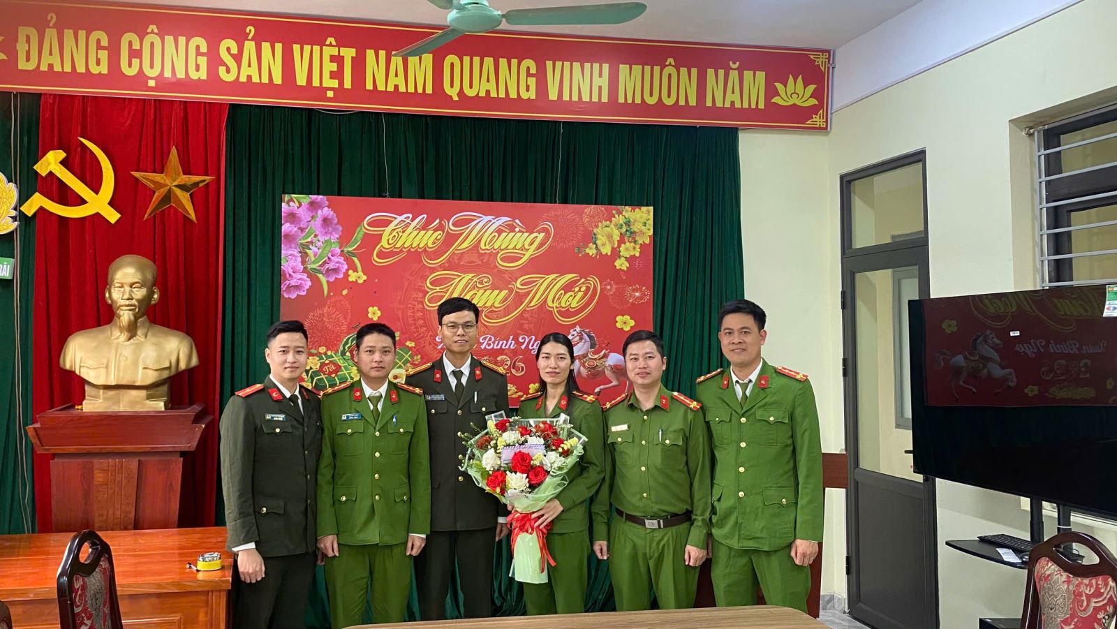 Chỉ huy và cán bộ Công an xã tặng hoa chúc mừng cán bộ, hội viên phụ nữ nhân ngày 08/3