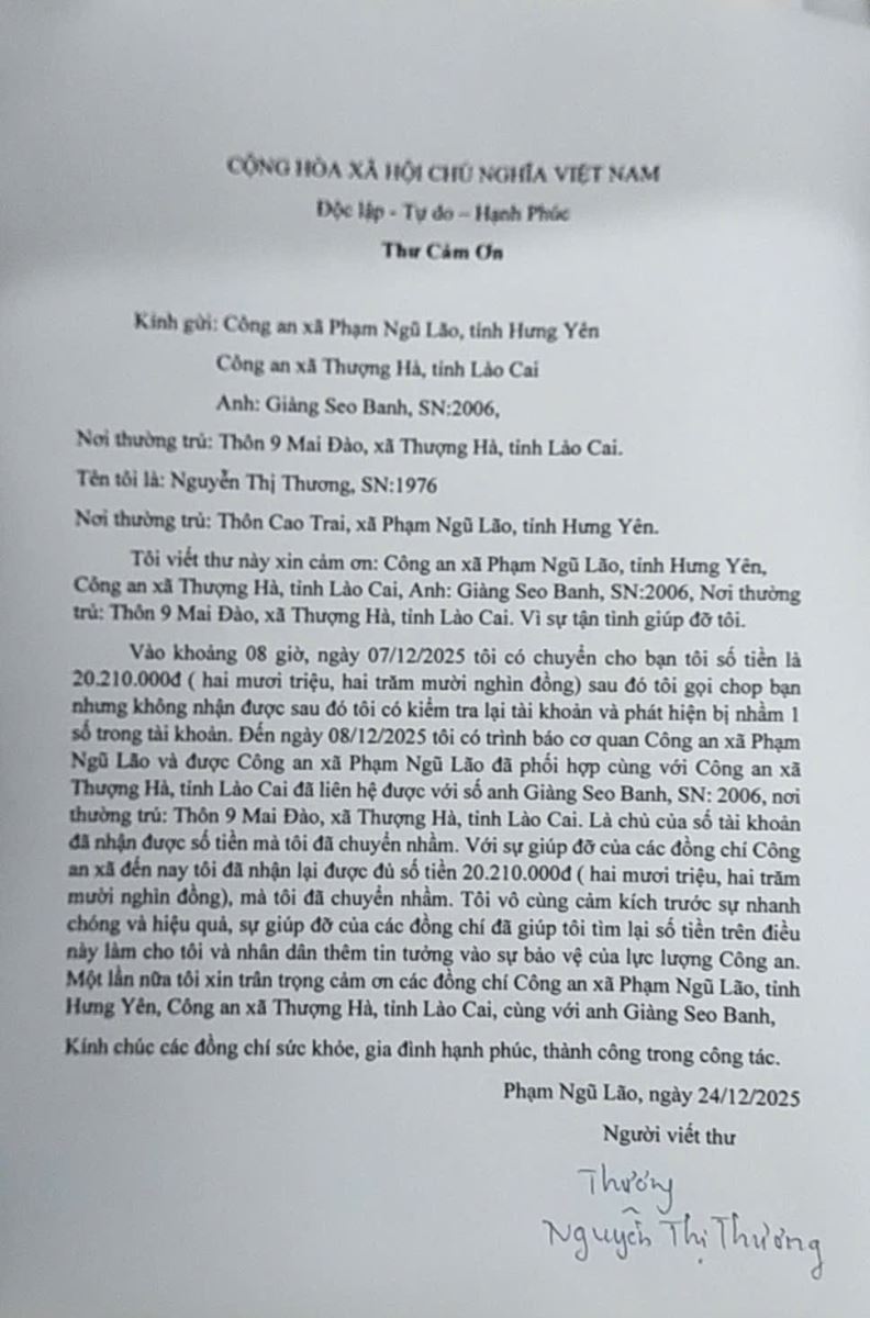 Ngày 08/12/2025, Công an xã Phạm Ngũ Lão tiếp nhận tin trình báo của chị Nguyễn Thị Thương, sinh năm 1976, thường trú tại thôn Cao Trai, xã Phạm Ngũ Lão, tỉnh Hưng Yên về việc chị chuyển khoản nhầm số tiền hơn 20 triệu đồng vào ngày 07/12/2025.