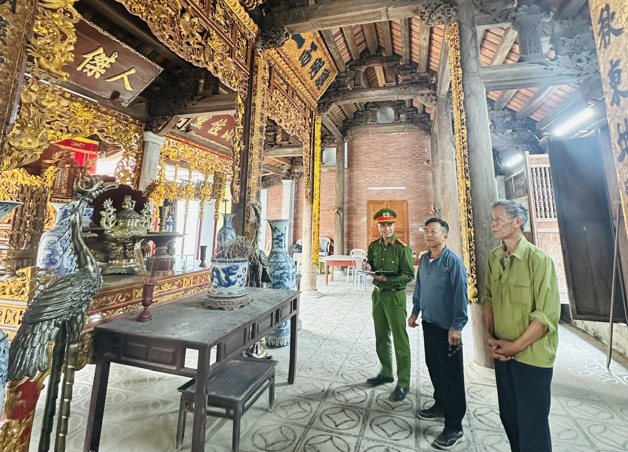 Cán bộ chiến sỹ Công an xã kiểm tra, hướng dẫn công tác bảo đảm an ninh trật tự tại đình Đông Linh
