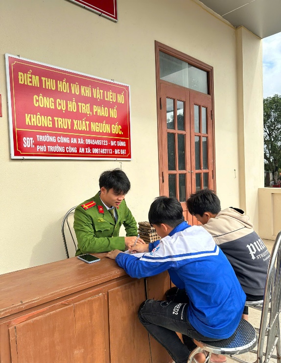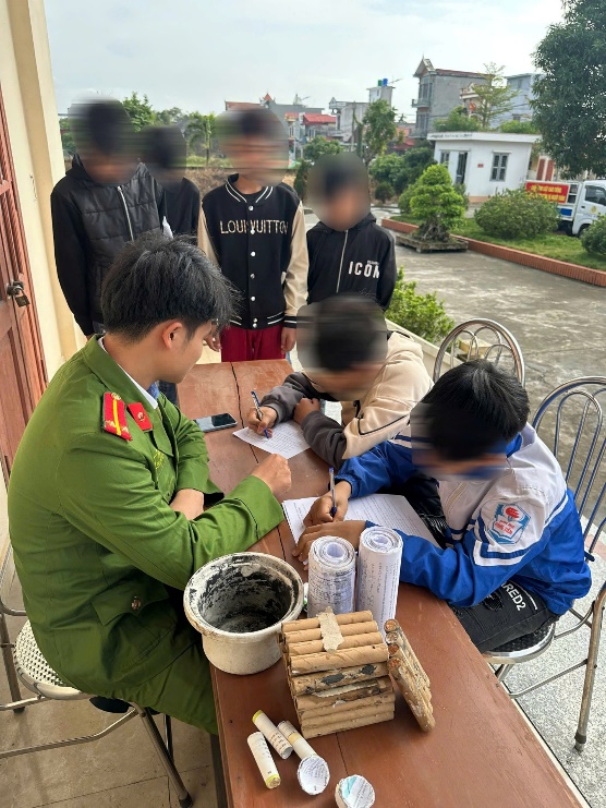 Công an xã làm việc với số học sinh tự giác giao nộp pháo tự chế
