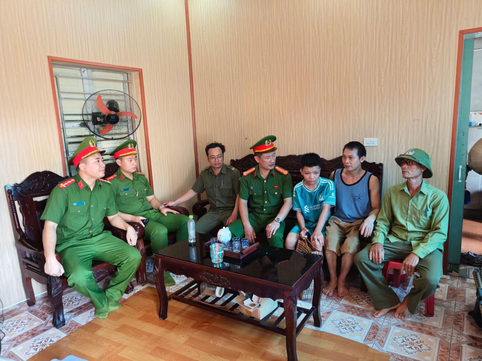 Đồng chí Trưởng Công an xã thay mặt CBCS Công an xã Tây Thụy Anh ân cần thăm hỏi, động viên các em và gia đình