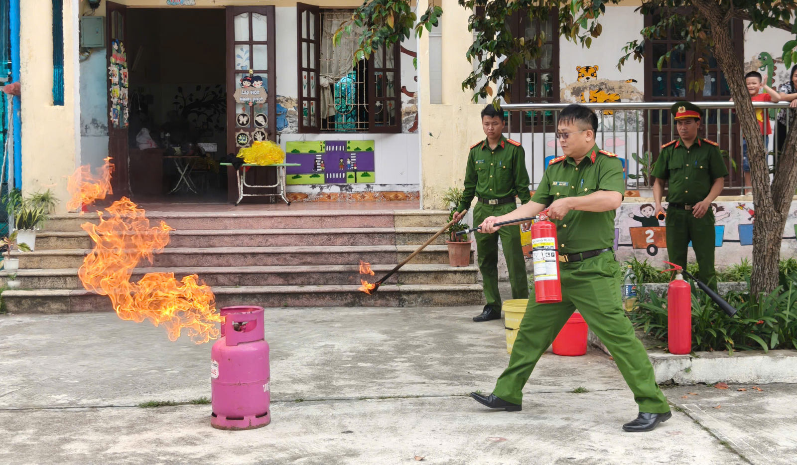 Bên cạnh đó, nội dung tuyên truyền về phòng cháy, chữa cháy được triển khai trực quan, hấp dẫn. Các cán bộ Công an đã hướng dẫn các em nhận biết nguy cơ cháy nổ trong sinh hoạt hằng ngày, đồng thời thực hành kỹ năng xử lý tình huống và thoát hiểm khi có cháy xảy ra. Những kiến thức tưởng chừng phức tạp đã được truyền tải một cách đơn giản, dễ nhớ, phù hợp với lứa tuổi mầm non.