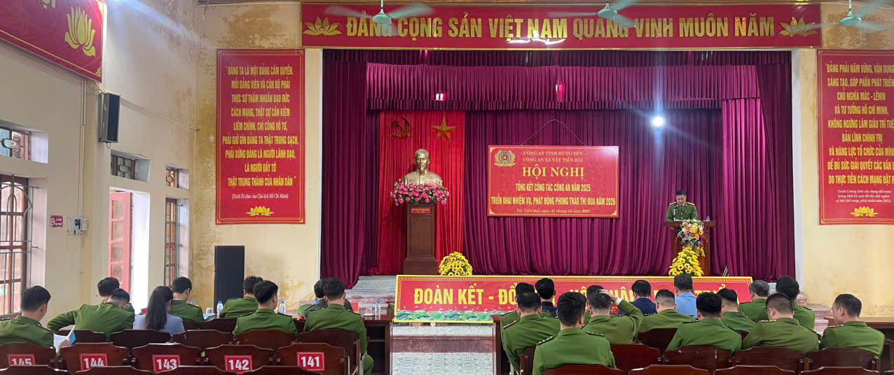 Ngày 31/12/2025, Công an xã Tây Tiền Hải tổ chức Hội nghị tổng kết công tác Công an, phong trào thi đua “Vì an ninh Tổ quốc” năm 2025 và triển khai công tác trọng tâm năm 2026. Dự hội nghị có đại diện lãnh đạo các phòng chức năng Công an tỉnh; Đồng chí Tô Quý Bôn - Bí thư Đảng uỷ, Chủ tịch HĐND xã; đồng chí Lại Hồng Thăng – Phó Chủ tịch UBND xã và các đồng chí thường trực Đảng ủy, lãnh đạo UBND xã Tây Tiền Hải; đại diện các Phòng, Ban, Ngành của xã; Tập thể lãnh đạo, chỉ huy, cán bộ, chiến sĩ Công an xã.