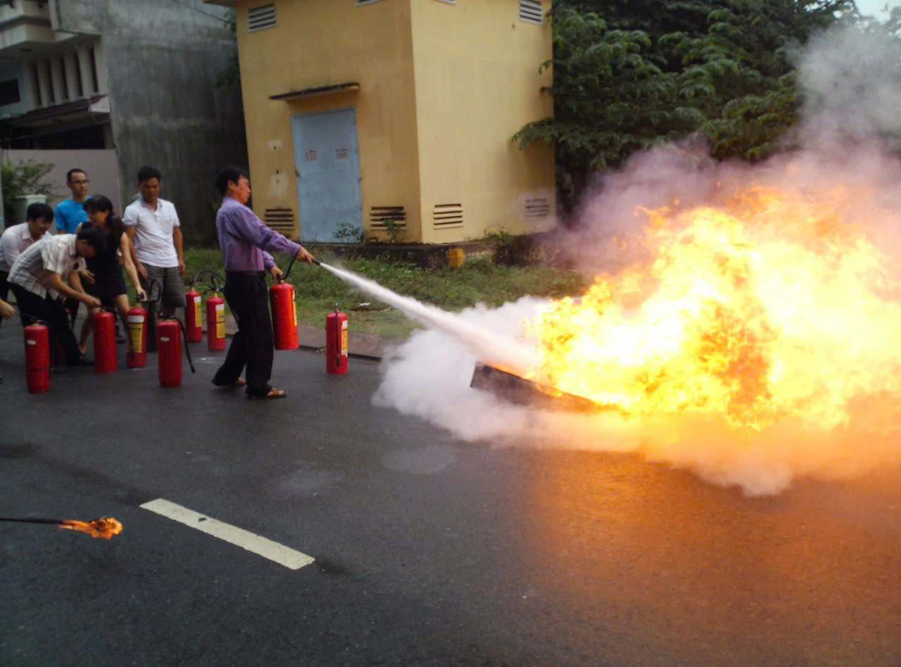 Các học viên tham gia thực hành sử dụng các bình chữa cháy tại buổi tập huấn