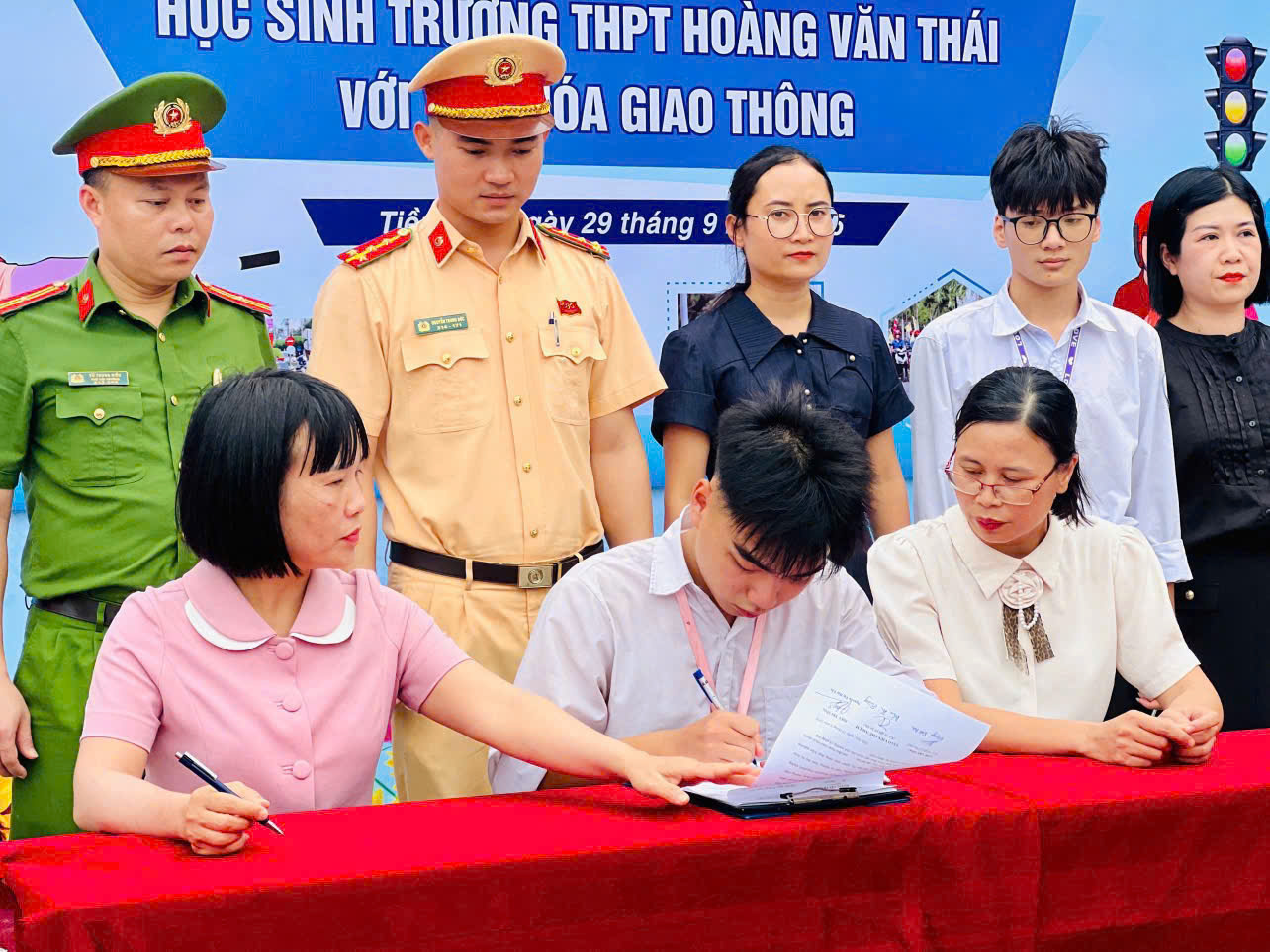 Giáo viên và học sinh trường THPT Hoàng Văn Thái kí cam kết chấp hành nghiêm các quy định khi tham gia giao thông.