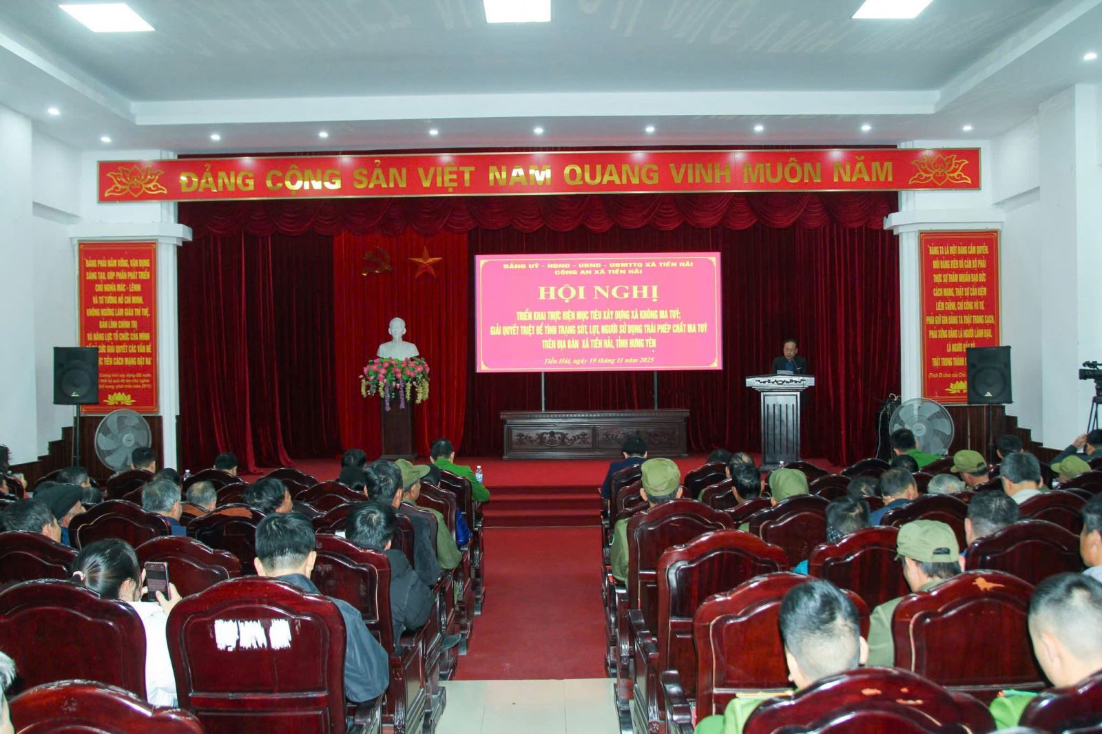Ngày 19/11/2025, Công an xã Tiền Hải tham mưu Ủy ban nhân dân xã tổ chức Hội nghị triển khai thực hiện mục tiêu xây dựng xã không ma túy; giải quyết triệt để tình trạng sót, lọt người sử dụng trái phép chất ma túy trên địa bàn xã Tiền Hải. Tham dự Hội nghị có đồng chí Thượng tá Phạm Văn Thiệp – Phó trưởng Phòng Cảnh sát điều tra tội phạm về ma túy, Công an tỉnh Hưng Yên; đồng chí Bùi Văn Vinh – Tỉnh ủy viên, Bí thư Đảng ủy, Chủ tịch HĐND xã; đồng chí Phạm Thị Huệ, Phó Bí thư Thường trực Đảng ủy; đồng chí Phan Nguyên Giáp, Phó Bí thư Đảng ủy, Chủ tịch UBND xã; cùng các ban, ngành đoàn thể xã, Bí thư, Tổ trưởng các thôn, lực lựng an ninh trật tự tại cơ sở cùng chỉ huy, cán bộ, chiến sĩ công an xã.