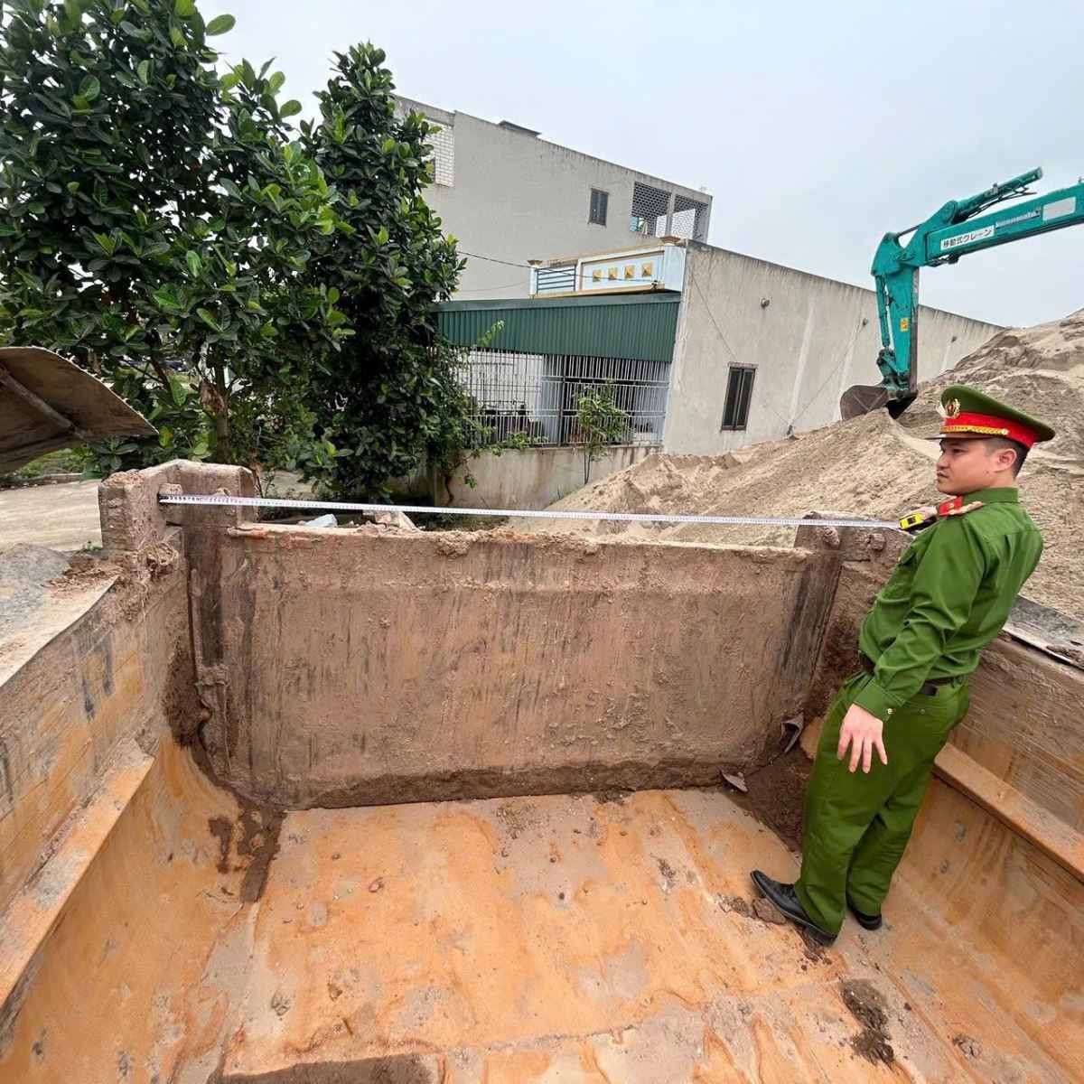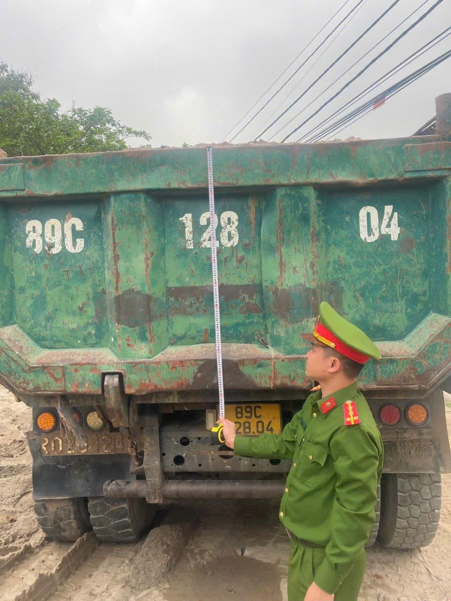 Cán bộ Công an xã Tiên Hoa kiểm tra kích thước phương tiện
