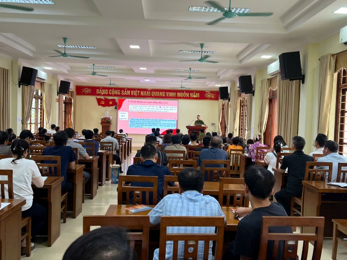 Đồng chí Thượng tá Đào Văn Bách PTP Cảnh sát PCCC & CNCH và Đồng chí Nguyễn Hữu Dương Chủ tịch UBND xã phát biểu tại hội nghị