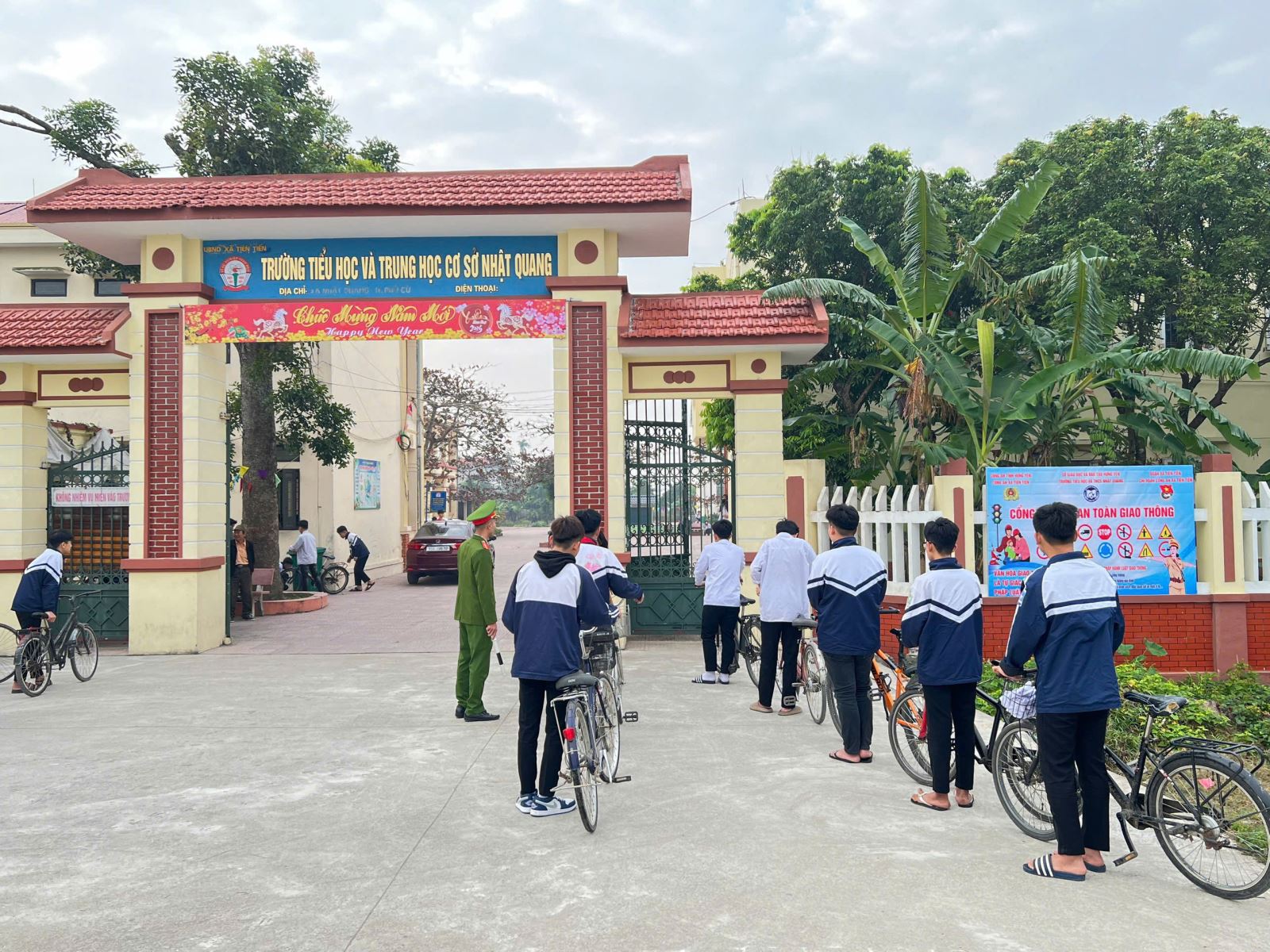 Theo đó, vào các khung giờ cao điểm học sinh đến trường và tan học, lực lượng Công an xã Tiên Tiến đã bố trí cán bộ, chiến sĩ trực tiếp tham gia hướng dẫn, phân luồng giao thông tại khu vực cổng trường; nhắc nhở phụ huynh dừng, đỗ xe đúng quy định, không tụ tập, lấn chiếm lòng đường, vỉa hè; hướng dẫn học sinh xếp hàng, đi xe đạp đúng phần đường, bảo đảm an toàn khi ra, vào cổng trường. Bên cạnh đó, Công an xã Tiên Tiến đã phối hợp với nhà trường, các tổ chức đoàn thể tuyên truyền, giáo dục pháp luật về trật tự an toàn giao thông cho học sinh thông qua các hình thức trực quan như lắp đặt pano, bảng tuyên truyền “Cổng trường an toàn giao thông”, phổ biến các quy tắc tham gia giao thông an toàn, văn minh; nhắc nhở học sinh chấp hành đội mũ bảo hiểm khi ngồi trên xe mô tô, xe gắn máy, không dàn hàng ngang, không đùa nghịch khi tham gia giao thông.