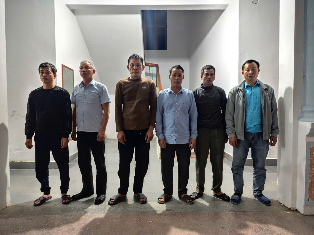 Tại thời điểm kiểm tra, lực lượng Công an xác định có 06 đối tượng tham gia, gồm: T.V.T; B.H.Q (SN 1976, trú thôn Dục Dương Đông); T.V.Th (SN 1976, trú thôn Trực Tầm); T.V.H (SN 1975, trú thôn Trực Tầm); V.V.Đ (SN 1976, trú thôn Năng Nhượng); T.V.C (SN 1976, trú thôn Trực Tầm), đều trú trên địa bàn xã Trà Giang. Quá trình kiểm tra, bắt giữ được tiến hành công khai, đúng quy định của pháp luật, có sự chứng kiến của các đối tượng. Tại hiện trường, Tổ công tác đã thu giữ 01 bộ bài tú lơ khơ 52 quân và số tiền 8.150.000 đồng là tang vật liên quan đến hành vi đánh bạc. Công an xã Trà Giang đã lập biên bản vụ việc, yêu cầu các đối tượng về trụ sở để làm việc, phục vụ công tác xác minh, củng cố hồ sơ xử lý theo quy định của pháp luật.
