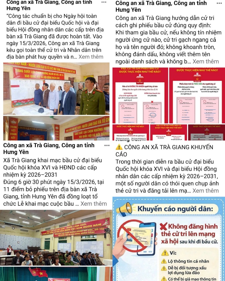 Đáng chú ý, nhằm bảo vệ thông tin cá nhân của cử tri trong thời gian diễn ra bầu cử, Công an xã đã chủ động ban hành khuyến cáo đến toàn thể Nhân dân. Theo đó, người dân được cảnh báo không chụp ảnh, đăng tải hình ảnh thẻ cử tri lên mạng xã hội như Facebook, Zalo; không chia sẻ các thông tin cá nhân quan trọng như họ tên, ngày sinh, khu vực bỏ phiếu… tránh bị các đối tượng xấu lợi dụng để thực hiện hành vi lừa đảo hoặc vi phạm pháp luật. Khuyến cáo cũng kêu gọi mỗi người dân nâng cao ý thức bảo vệ thông tin cá nhân, sử dụng mạng xã hội an toàn, có trách nhiệm, góp phần bảo đảm an ninh, an toàn cho chính mình và cộng đồng.