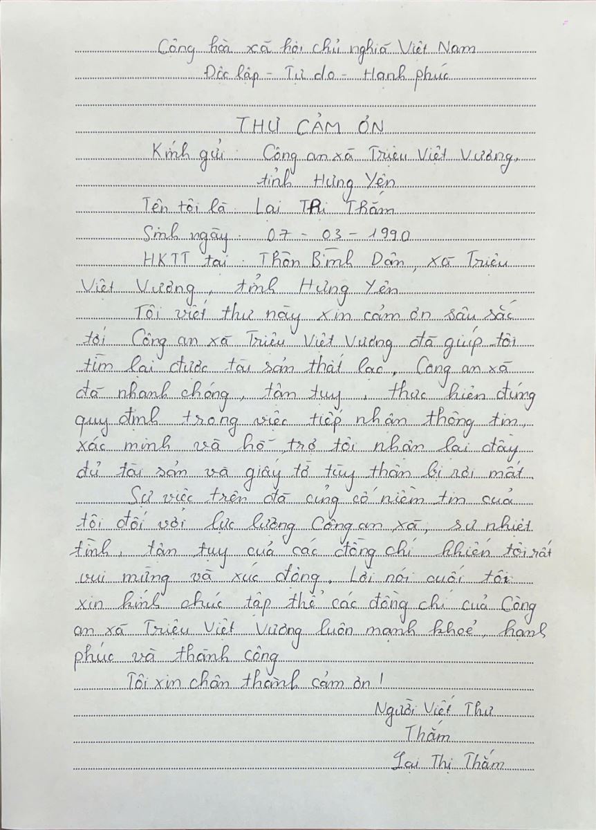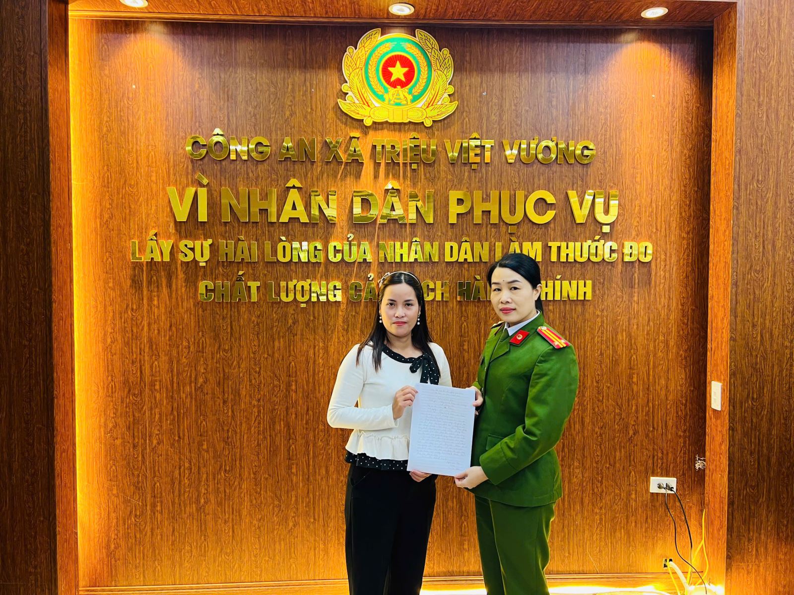 Vào ngày 12/02/2026, tại trụ sở Công an xã Triệu Việt Vương, Công an xã đã bàn giao lại tài sản cho chị Thắm. Sau khi nhận lại tài sản, chị Thắm bày tỏ sự xúc động, đồng thời gửi thư cảm ơn lực lượng Công an xã Triệu Việt Vương vì tinh thần trách nhiệm, tác phong làm việc nghiêm túc, tận tình trong quá trình tiếp nhận và giải quyết vụ việc.