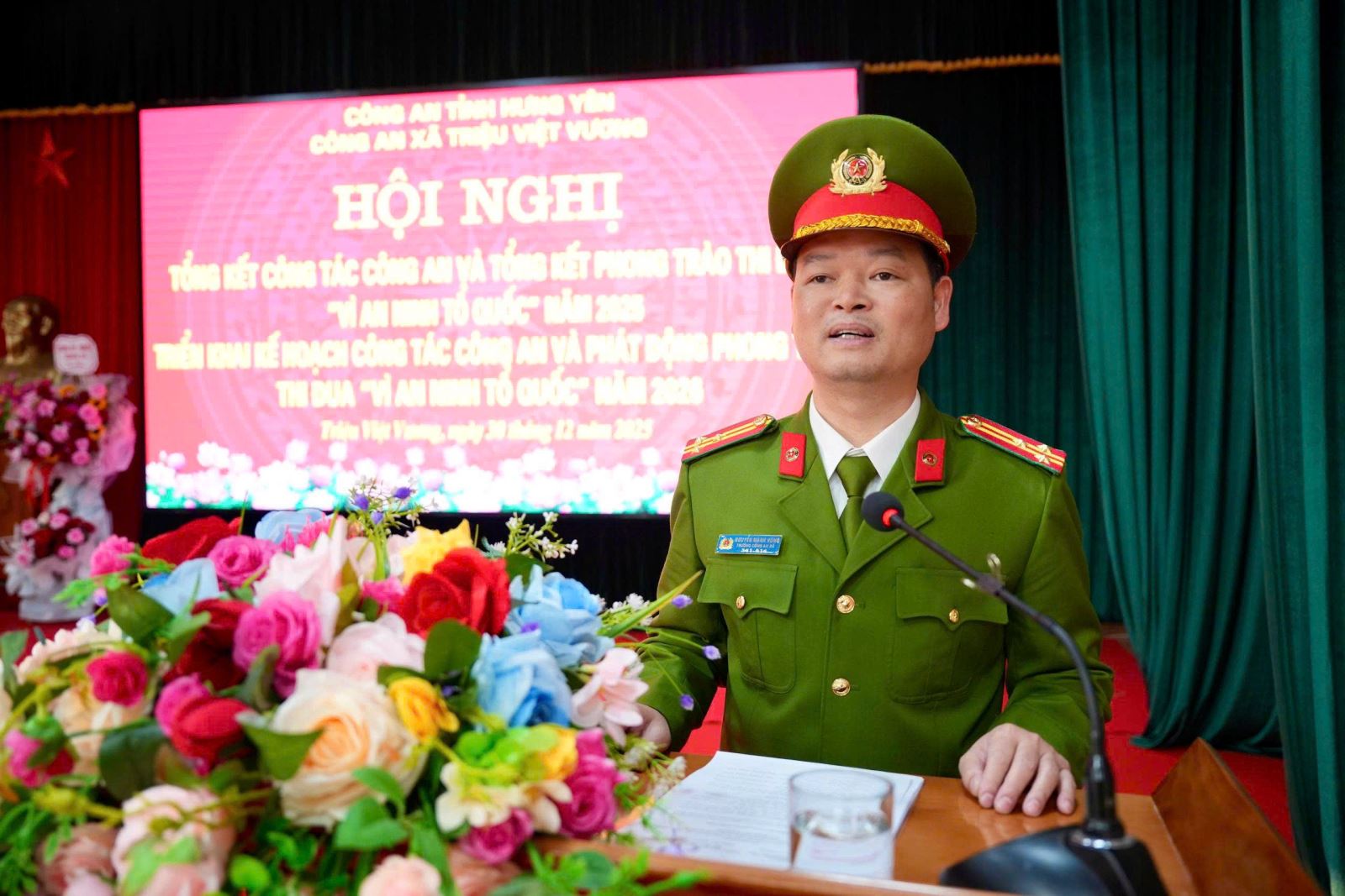 Phát biểu chỉ đạo tại Hội nghị, đồng chí Lê Hải Nam yêu cầu Công an xã Triệu Việt Vương tiếp tục quán triệt, triển khai nghiêm túc các chỉ đạo của Bộ Công an, Công an tỉnh; không ngừng đổi mới tư duy, phương pháp công tác; tạo sự thống nhất cao trong thực hiện nhiệm vụ bảo đảm an ninh, trật tự với tinh thần “Hành động quyết liệt – Kết quả vượt trội”, quyết tâm hoàn thành thắng lợi các chỉ tiêu, nhiệm vụ chính trị năm 2026, góp phần giữ vững an ninh quốc gia, bảo đảm trật tự an toàn xã hội trong giai đoạn phát triển mới của đất nước.