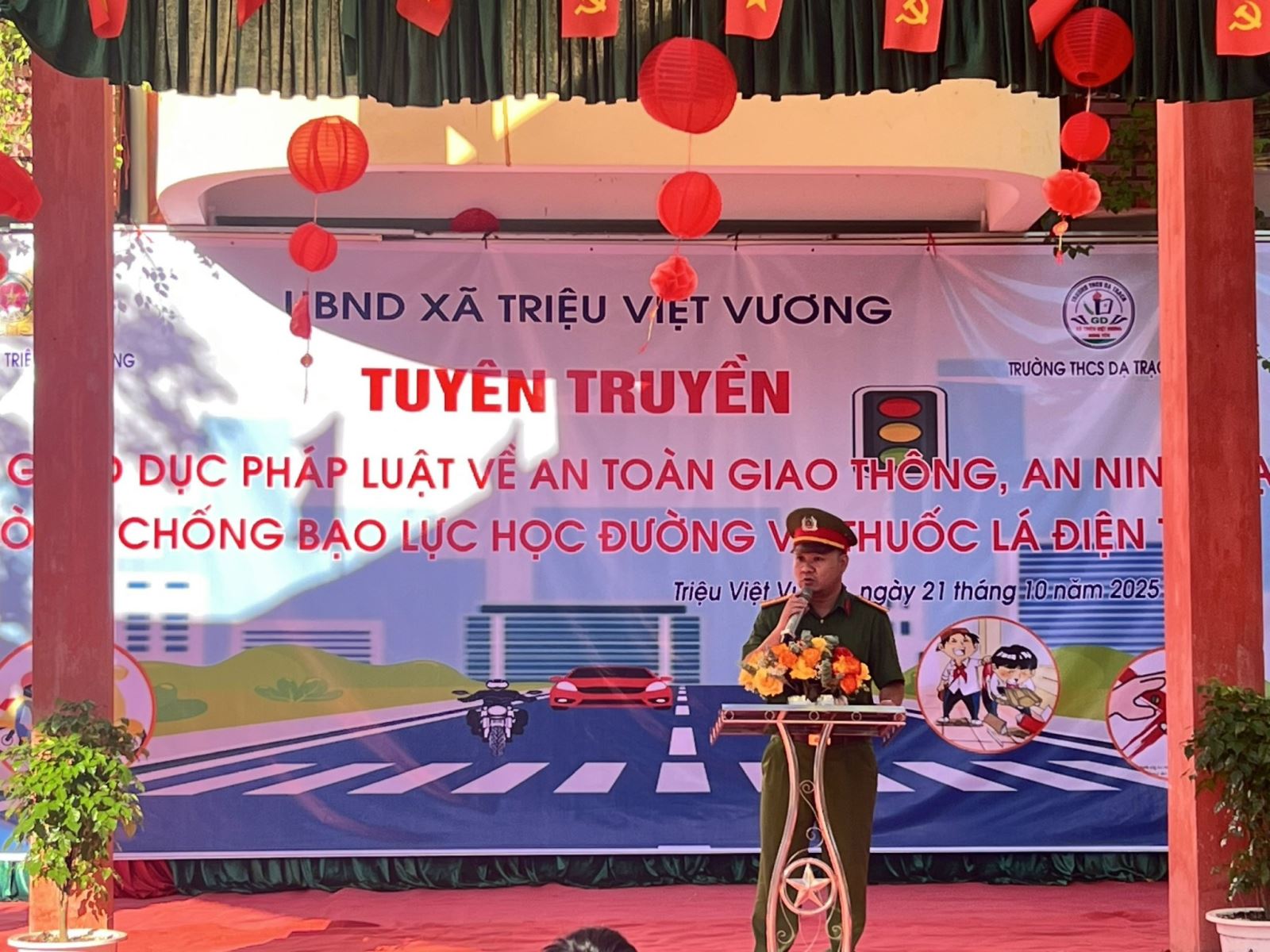 Ngày 21/10/2025, Công an xã Triệu Việt Vương phối hợp cùng Trường Trung học cơ sở Dạ Trạch tổ chức buổi tuyên truyền, giáo dục pháp luật về an toàn giao thông, an ninh mạng, phòng chống tác hại của ma túy và phòng chống bạo lực học đường cho các em học sinh, giáo viên nhà trường.