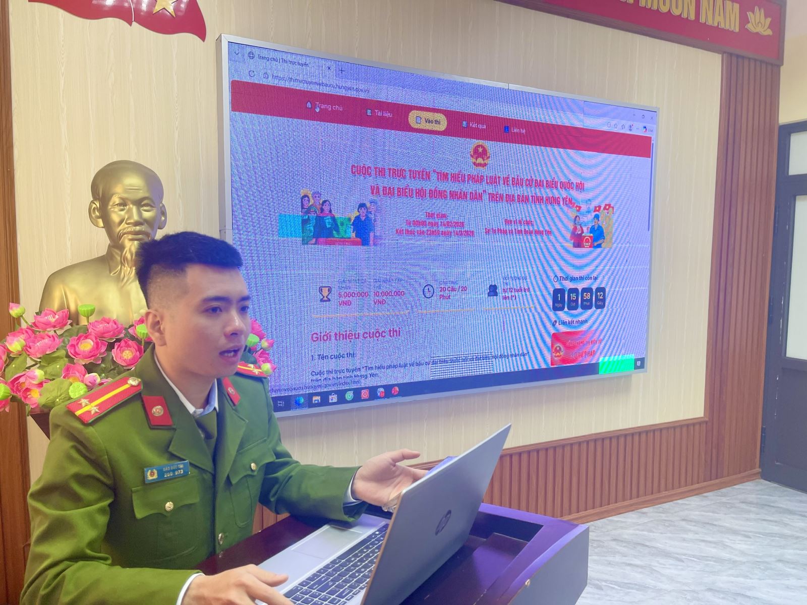 Tại buổi phát động, Chỉ huy và cán bộ, chiến sĩ Công an xã đã được giới thiệu, hướng dẫn: cách truy cập vào Website chính thức của cuộc thi, điền các thông tin cơ bản, số lượng câu hỏi, thời gian làm bài… Ngay sau khi được hướng dẫn, Chỉ huy và toàn thể cán bộ, chiến sĩ đã tìm hiểu, nghiên cứu các câu hỏi và tham gia thi tập trung ngay tại buổi phát động.