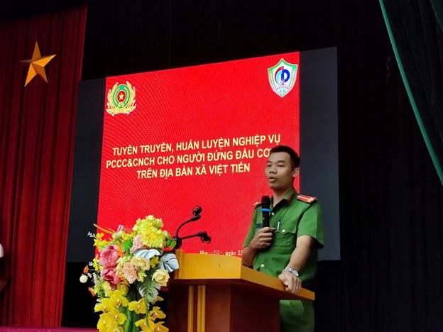 Phát biểu chỉ đạo tại hội nghị tập huấn, đồng chí Nguyễn Đức Đoàn, Chủ tịch Uỷ ban nhân dân xã Việt Tiến nhấn mạnh: công tác phòng cháy, chữa cháy là trách nhiệm của toàn dân, việc nâng cao nhận thức, kỹ năng phòng cháy, chữa cháy không chỉ giúp bảo vệ tài sản, tính mạng của mỗi cá nhân, gia đình, doanh nghiệp, cơ sở kinh doanh mà còn góp phần đảm bảo an ninh, trật tự trên địa bàn xã. Do đó, đồng chí đề nghị các ban, ngành, đoàn thể xã, chủ các cơ sở, người được phân công nhiệm vụ PCCC của cơ sở thuộc diện quản lý về PCCC và Nhân dân trên địa bàn xã tiếp tục phát huy sức mạnh tổng hợp của toàn dân tham gia hoạt động PCCC, lấy phòng ngừa là chính; phải tích cực và chủ động phòng ngừa, hạn chế đến mức thấp nhất các vụ cháy xảy ra và thiệt hại do cháy gây ra. Phải chuẩn bị sẵn sàng lực lượng, phương tiện, phương án và các điều kiện khác để khi có cháy xảy ra thì chữa cháy kịp thời, có hiệu quả, đảm bảo gắn với phương châm “4 tại chỗ”: “Chỉ huy tại chỗ - Lực lượng tại chỗ - Phương tiện tại chỗ - Hậu cần tại chỗ”.