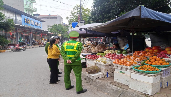 Cán bộ, chiến sĩ nhắc nhở các hộ kinh doanh, buôn bán chấp hành nghiêm việc bảo đảm hành lang an toàn giao thông