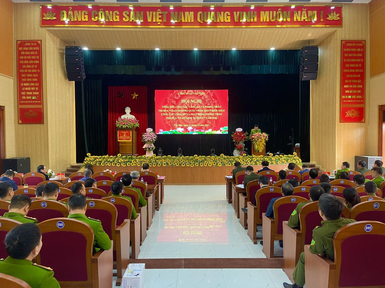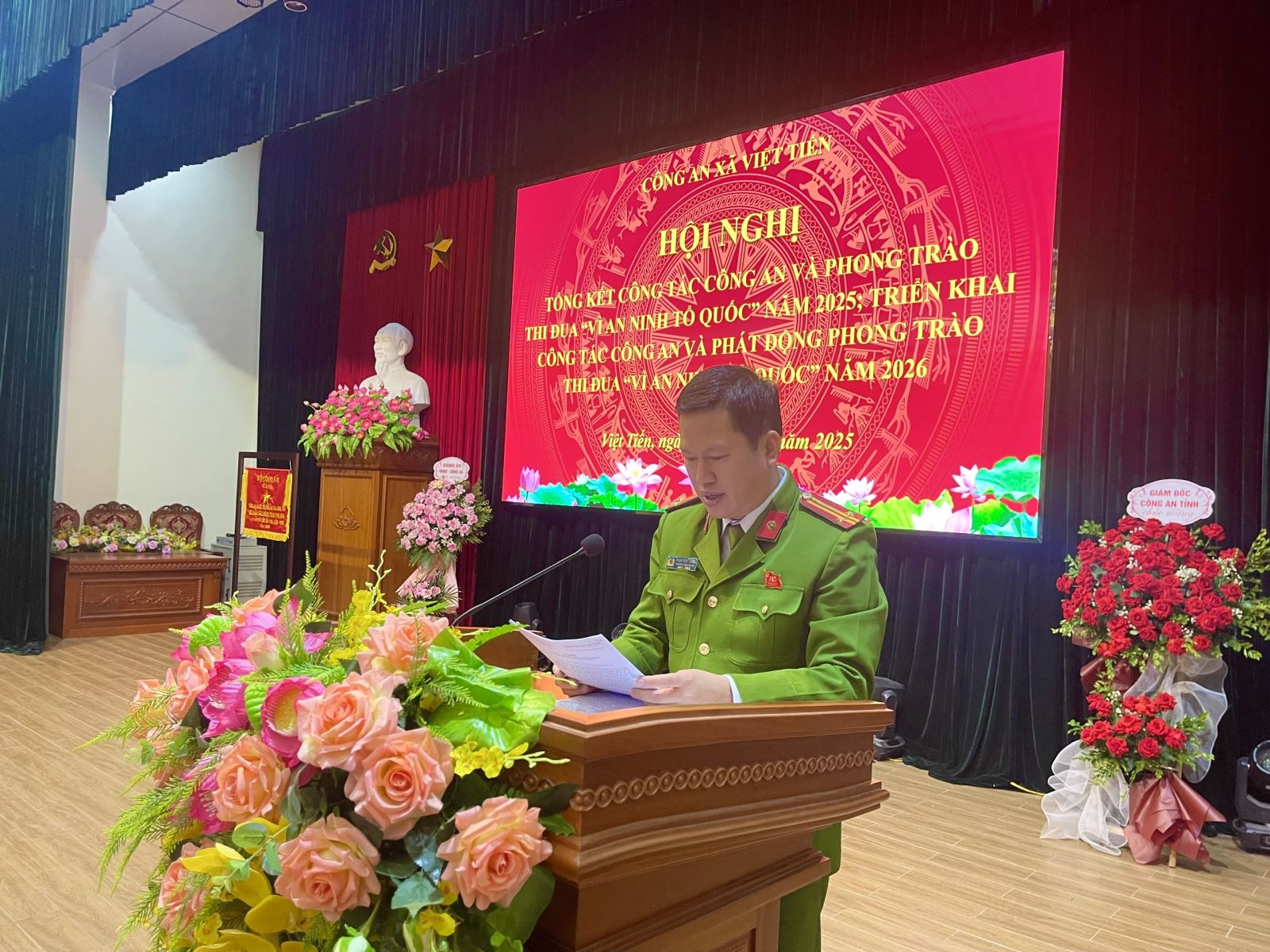 Ngày 25/12/2025, Công an xã Việt Tiến tổ chức Hội nghị tổng kết công tác Công an và phong trào thi đua “Vì an ninh Tổ quốc” năm 2025; triển khai công tác Công an và phát động phong trào thi đua “Vì an ninh Tổ quốc” năm 2026. Dự và chỉ đạo Hội nghị có đồng chí Đại tá Vũ Mạnh Hà - Phó Giám đốc Công an tỉnh; đồng chí Hoàng Văn Tựu - Bí thư Đảng uỷ, Chủ tịch Hội đồng nhân dân xã (HĐND); đồng chí Nguyễn Đức Đoàn - Phó Bí thư Đảng uỷ, Chủ tịch Uỷ ban nhân dân xã (UBND); đại diện Lãnh đạo một số phòng nghiệp vụ Công an tỉnh; đại diện các phòng, ban ngành, đoàn thể xã, lực lượng tham gia bảo vệ an ninh trật tự ở cơ sở cùng toàn thể cán bộ, chiến sĩ Công an xã Việt Tiến.
