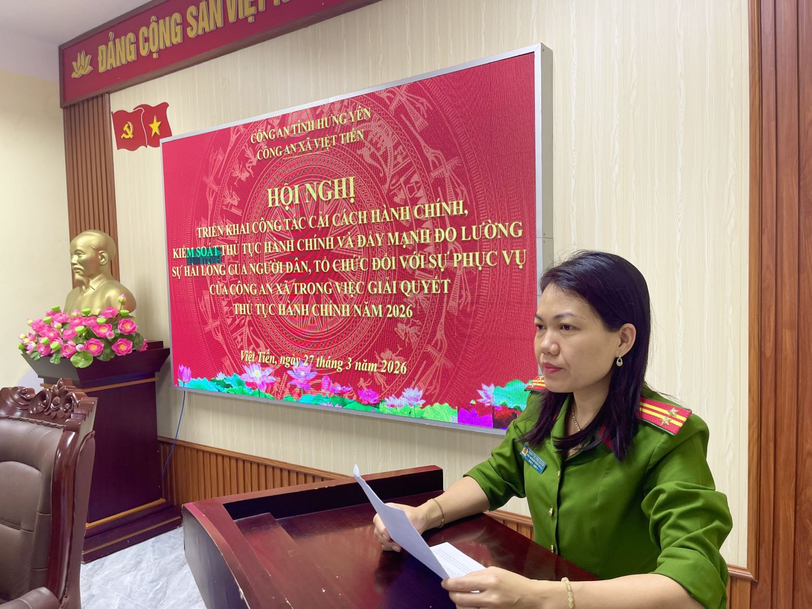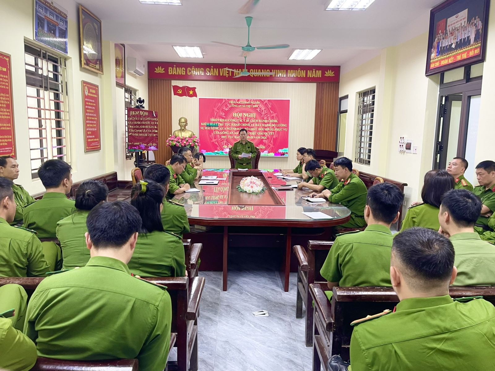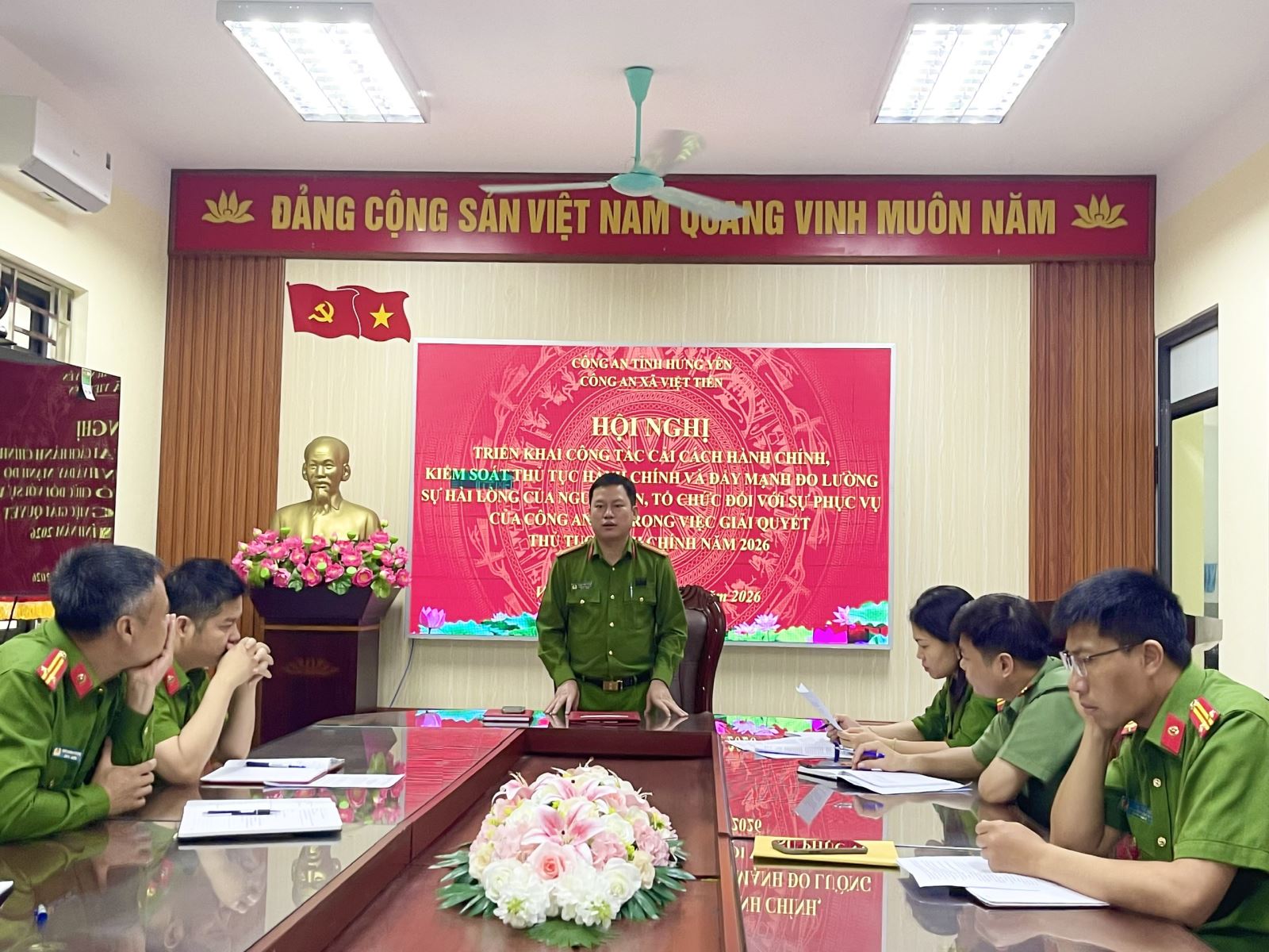 Nhằm thực hiện hiệu quả công tác cải cách hành chính trong Công an xã năm 2026, ngày 27/3/2026, Công an xã Việt Tiến đã tổ chức Hội nghị triển khai công tác cải cách hành chính, kiểm soát thủ tục hành chính và đẩy mạnh đo lường sự hài lòng của người dân, tổ chức đối với sự phục vụ của Công an xã trong giải quyết thủ tục hành chính. Tham dự hội nghị có đồng chí Trung tá Phạm Văn Tưởng - Trưởng Công an xã, các đồng chí Phó Trưởng Công an xã cùng toàn thể cán bộ, chiến sĩ Công an xã Việt Tiến.