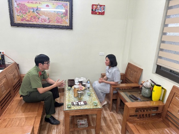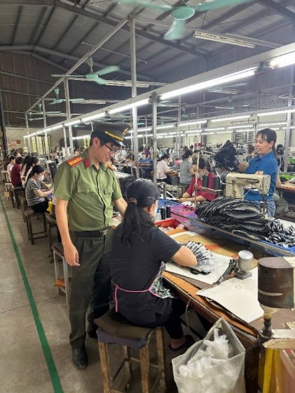 Công an xã tiếp xúc với công nhân, tiến hành nắm bắt tâm tư, nguyện vọng của người lao động