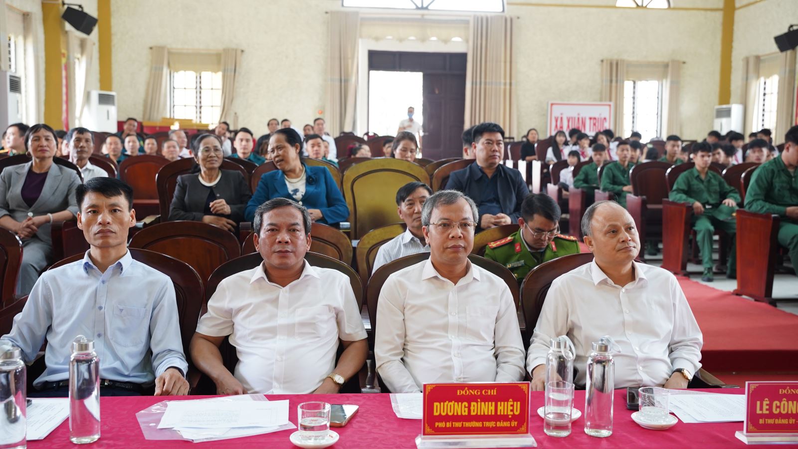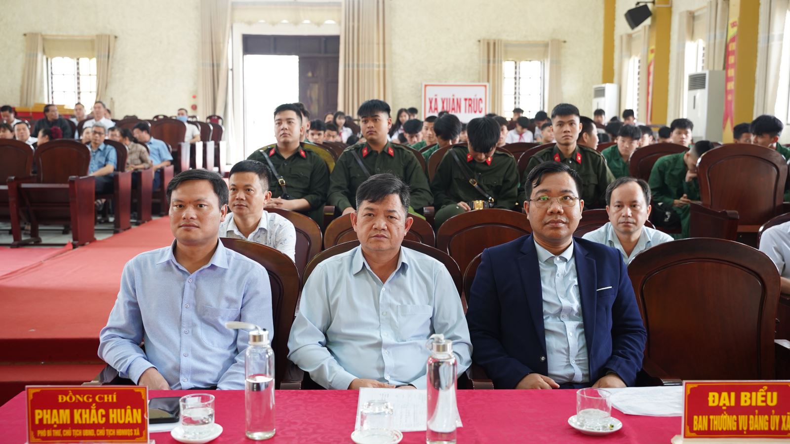 Tham dự buổi giao lưu có các đồng chí lãnh đạo xã gồm: đồng chí Lê Công Tuấn – Bí thư Đảng ủy, Chủ tịch HĐND xã; đồng chí Dương Đình Hiệu – Phó Bí thư Thường trực Đảng ủy xã; đồng chí Phạm Khắc Huân – Phó Bí thư Đảng ủy, Chủ tịch UBND xã, Chủ tịch Hội đồng Nghĩa vụ quân sự xã; cùng các đồng chí trong Ban Thường vụ Đảng ủy, Thường trực HĐND, lãnh đạo UBND, Ủy ban MTTQ Việt Nam xã, trưởng các ban, ngành, đoàn thể, Ban Chỉ huy Quân sự xã, Công an xã, Ban Giám hiệu các trường, Bí thư Chi bộ, Trưởng thôn và 43 thanh niên ưu tú chuẩn bị lên đường thực hiện nghĩa vụ năm 2026.
