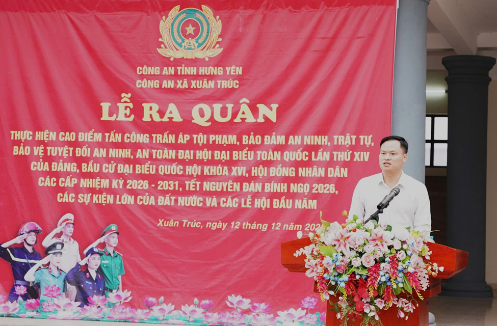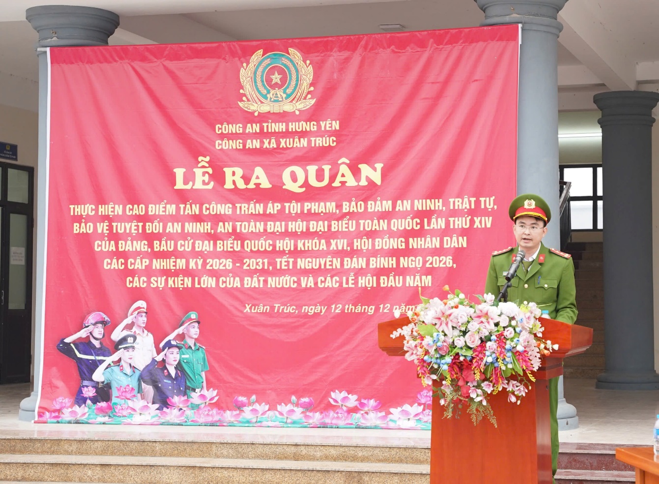 Sáng ngày 12/12/2025, Công an xã Xuân Trúc long trọng tổ chức lễ ra quân cao điểm tấn công, trấn áp tội phạm, bảo đảm an ninh, trật tự, bảo vệ tuyệt đối an ninh, an toàn Đại hội đại biểu toàn quốc lần thứ XIV của Đảng, bầu cử đại biểu Quốc hội khóa XVI và Hội đồng nhân dân các cấp nhiệm kỳ 2026 – 2031, Tết Nguyên đán Bính Ngọ 2026, cùng các sự kiện chính trị, lễ hội lớn của đất nước và địa phương. Tham dự buổi lễ có đồng chí Phạm Khắc Huân – Phó Bí thư Đảng ủy, Chủ tịch UBND xã Xuân Trúc, đại diện chỉ huy Công an xã cùng toàn thể cán bộ, chiến sĩ trong đơn vị.
