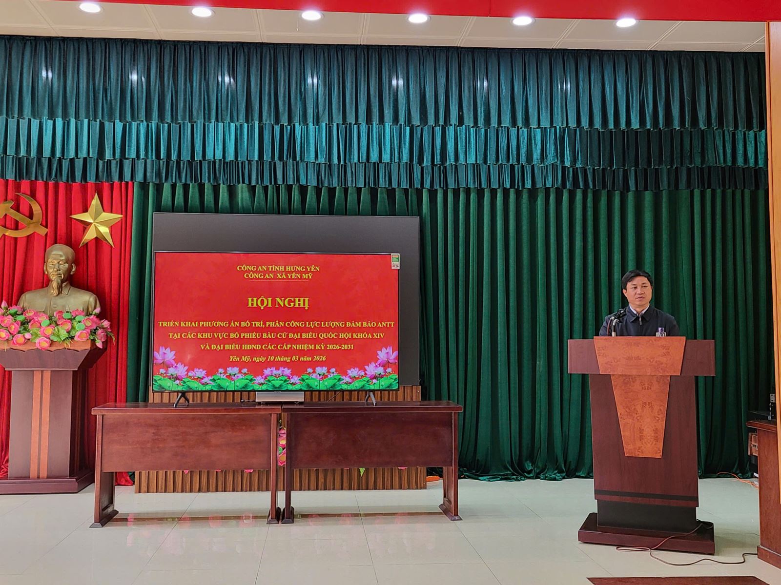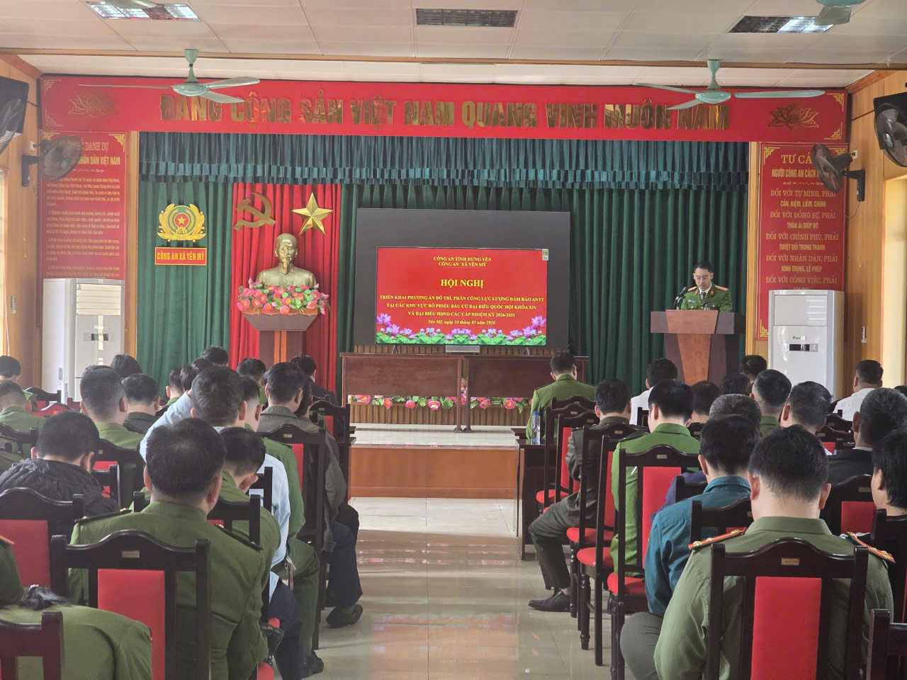 Tại hội nghị, thay mặt Công an xã, Đồng chí Bùi Xuân Tú đã triển khai phương án bố trí, phân công lực lượng làm nhiệm vụ bảo đảm an ninh, trật tự tại các khu vực bỏ phiếu trên địa bàn; tập trung vào các nhiệm vụ trọng tâm như: nắm chắc tình hình địa bàn, chủ động phòng ngừa, phát hiện và xử lý kịp thời các vụ việc phát sinh; bảo đảm an ninh chính trị nội bộ, an ninh nông thôn; tăng cường công tác tuần tra, kiểm soát, phòng ngừa tội phạm và các hành vi vi phạm pháp luật; đồng thời tổ chức lực lượng thường trực, sẵn sàng xử lý các tình huống phức tạp có thể xảy ra, góp phần bảo đảm an ninh, an toàn tuyệt đối cho các khu vực bỏ phiếu.