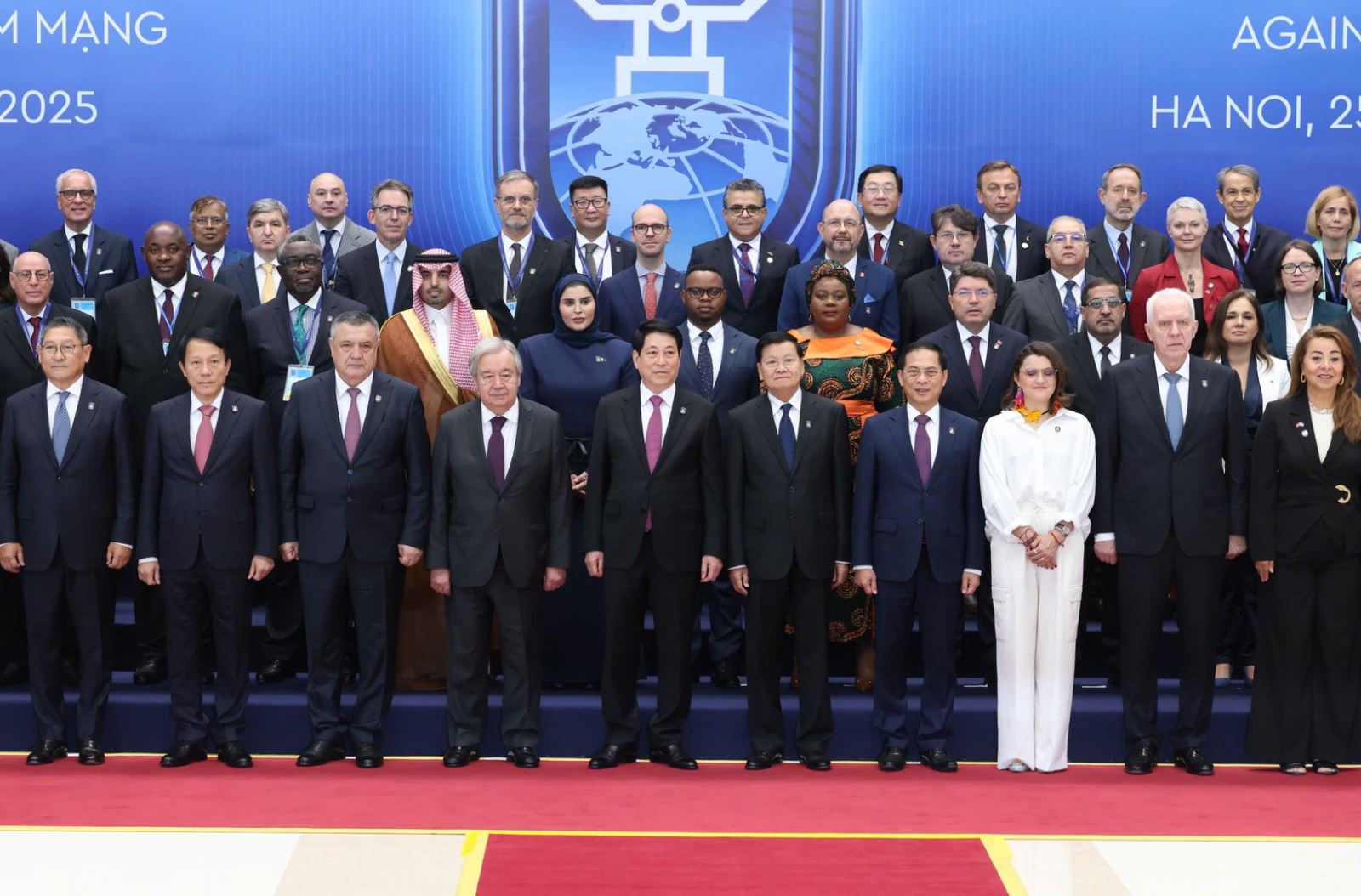 Chủ tịch nước Lương Cường đã chủ trì lễ đón chính thức và chụp ảnh chung cùng các Trưởng đoàn tham dự Lễ mở ký và Hội nghị cấp cao Công ước LHQ về chống tội phạm mạng.