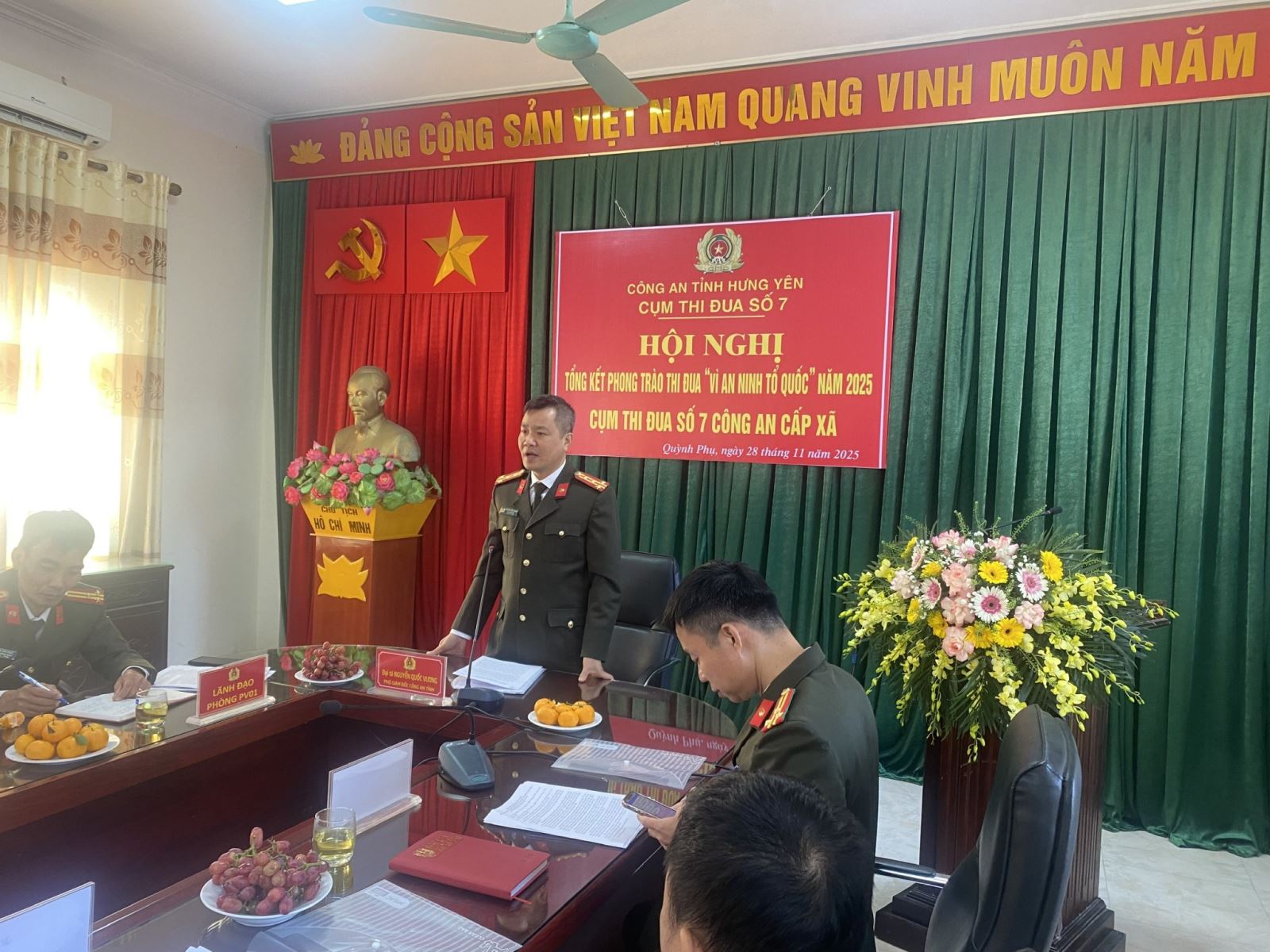Năm 2025, dưới sự lãnh đạo, chỉ đạo sát sao của Đảng ủy và Ban Giám đốc Công an tỉnh, các đơn vị trong Cụm thi đua số 7 đã chủ động xây dựng chương trình, kế hoạch công tác ngay từ khi sáp nhập, đồng thời phát động mạnh mẽ phong trào thi đua “Vì an ninh Tổ quốc” với nhiều hình thức linh hoạt, phù hợp với tình hình thực tế tại cơ sở. Công an xã Quỳnh Phụ với vai trò là Cụm trưởng đã kịp thời ban hành bộ tiêu chí chấm điểm, xác định rõ chỉ tiêu thi đua trên từng lĩnh vực, tạo cơ sở đánh giá khách quan, thúc đẩy phong trào thi đua đi vào chiều sâu. Công tác giáo dục chính trị tư tưởng, xây dựng Đảng và xây dựng lực lượng tiếp tục được chú trọng; việc phát hiện, bồi dưỡng và nhân rộng các điển hình tiên tiến được triển khai thường xuyên. Cùng với đó, nhiều tập thể, cá nhân có thành tích nổi bật được tuyên dương, khen thưởng kịp thời, tạo khí thế thi đua sôi nổi, khích lệ cán bộ, chiến sĩ nỗ lực hoàn thành xuất sắc nhiệm vụ, góp phần giữ vững an ninh chính trị, trật tự an toàn xã hội trên địa bàn.
