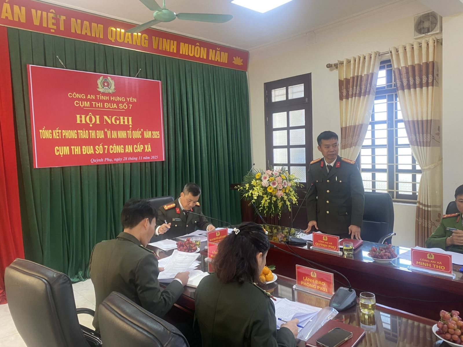 Tại hội nghị, Trung tá Nguyễn An Thủy, Phó Trưởng Công an xã Quỳnh Phụ đã trình bày báo cáo tổng kết phong trào thi đua “Vì an ninh Tổ quốc” năm 2025 của Cụm thi đua số 7. Các đại biểu trong Cụm đã sôi nổi thảo luận, chia sẻ những kết quả nổi bật, kinh nghiệm thực tiễn cùng nhiều mô hình, cách làm sáng tạo trong triển khai phong trào tại đơn vị. Bên cạnh việc chỉ ra những tồn tại, hạn chế, các đơn vị cũng đề xuất nhiều giải pháp nhằm tiếp tục nâng cao chất lượng phong trào trong thời gian tới. Hội nghị đã công bố kết quả chấm điểm, xếp loại và suy tôn các danh hiệu thi đua năm 2025.