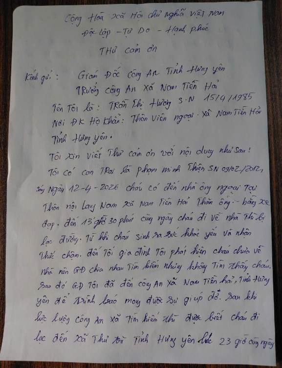 Trước đó, vào chiều ngày 12/04/2026, Công an xã Nam Tiền Hải tiếp nhận trình báo của chị Trần Thị Hương sinh năm 1985, trú tại thôn Viên Ngoại xã Nam Tiền Hải, về việc con trai chị là cháu P.M.T sinh năm 2012 bị đi lạc, không trở về nhà sau khi đi xe đạp một mình đến thăm nhà ông ngoại tại thôn Nội Lang Nam, xã Nam Tiền Hải.