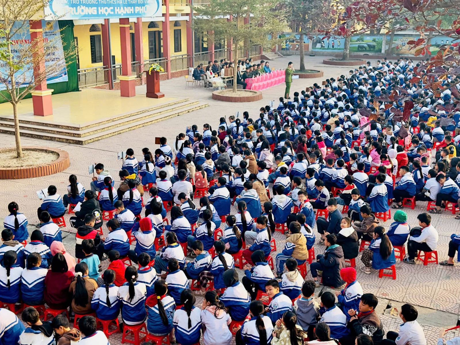 Công an xã Hồng Quang tổ chức tuyên truyền, phổ biến pháp luật, lồng ghép nội dung cảnh báo phương thức, thủ đoạn hoạt động của các loại tội phạm và hoạt động xuyên tạc, kích động trên không gian mạng tại các Trường TH và THCS trên địa bàn.