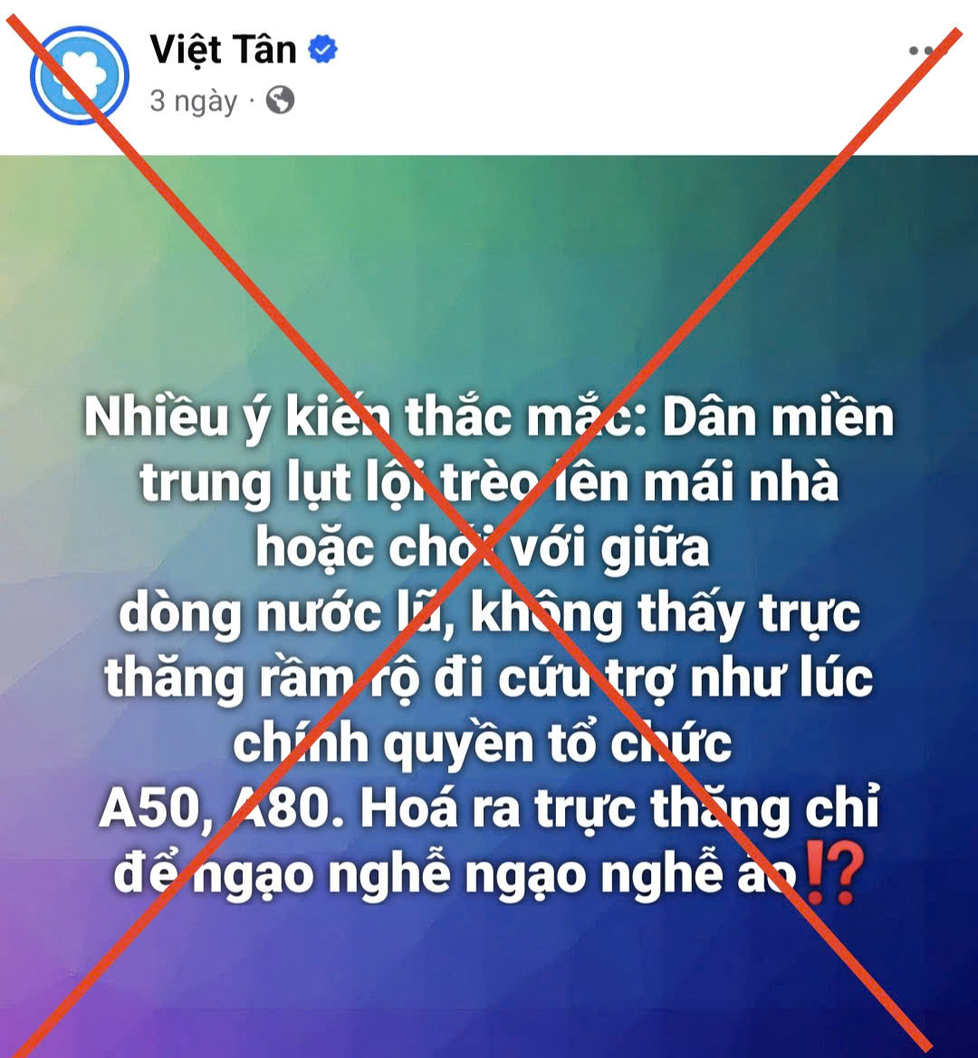 Ấy vậy mà, tổ chức phản động Việt Tân lại xuyên tạc với nội dung cho rằng: “dân miền Trung lụt lội trèo trên mái nhà hoặc chới với giữa dòng nước lũ, không thấy trực thăng rầm rộ đi cứu trợ như lúc chính quyền tổ chức A50, A80. Hóa ra trực thăng chỉ để ngạo nghễ ngạo nghễ ảo” nhằm xuyên tạc, bôi nhọ, làm giảm uy tín của lực lượng vũ trang và chính quyền các cấp. Đây là luận điệu hoàn toàn sai sự thật, thiếu hiểu biết và mang động cơ xấu.