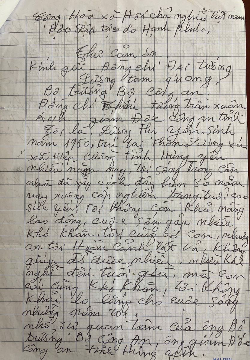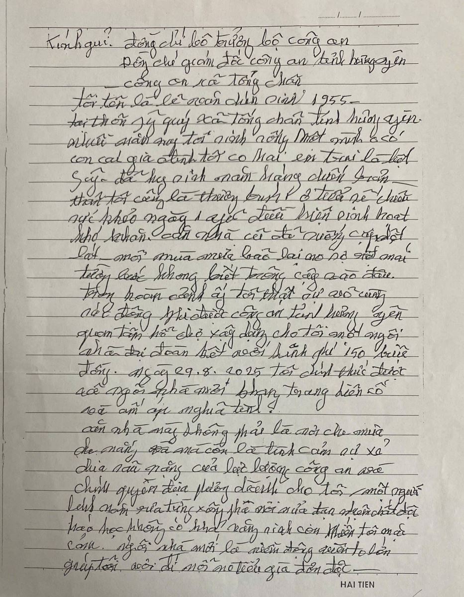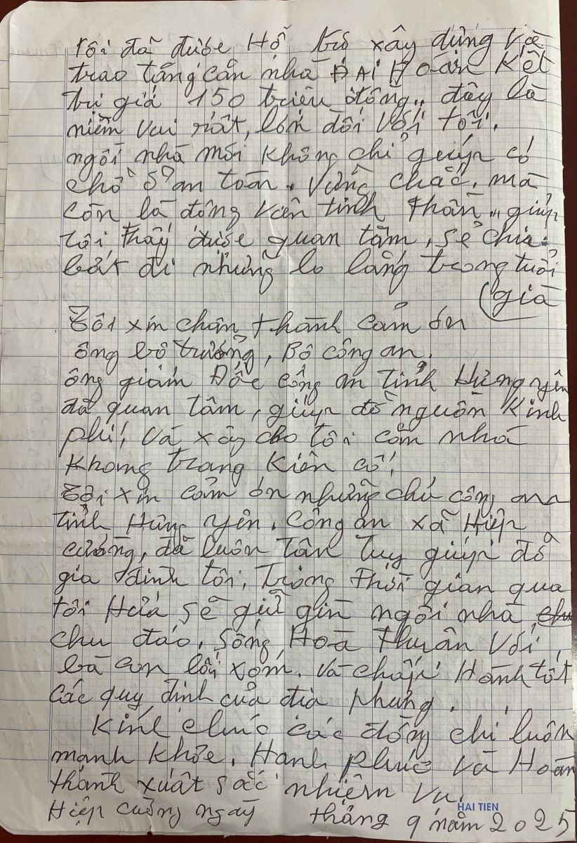 Trong thư, các hộ dân bày tỏ lòng xúc động và biết ơn sâu sắc trước sự quan tâm của lãnh đạo Bộ Công an, Công an tỉnh cùng cán bộ, chiến sĩ đã trực tiếp khảo sát, hỗ trợ xây dựng và bàn giao ngôi nhà mới khang trang, kiên cố, trị giá 150 triệu đồng. Bà Lương Thị Yến viết: “Ngôi nhà mới không chỉ giúp tôi có chỗ ở an toàn, vững chắc, mà còn là nguồn động viên tinh thần, giúp tôi thấy được quan tâm, sẻ chia, bớt đi những lo lắng trong tuổi già”.