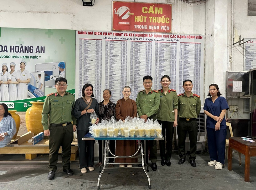 Cán bộ đoàn thanh niên Phòng An ninh nội địa cùng nhà hảo tâm phát cháo, sữa tại Bệnh viện Hoàng An