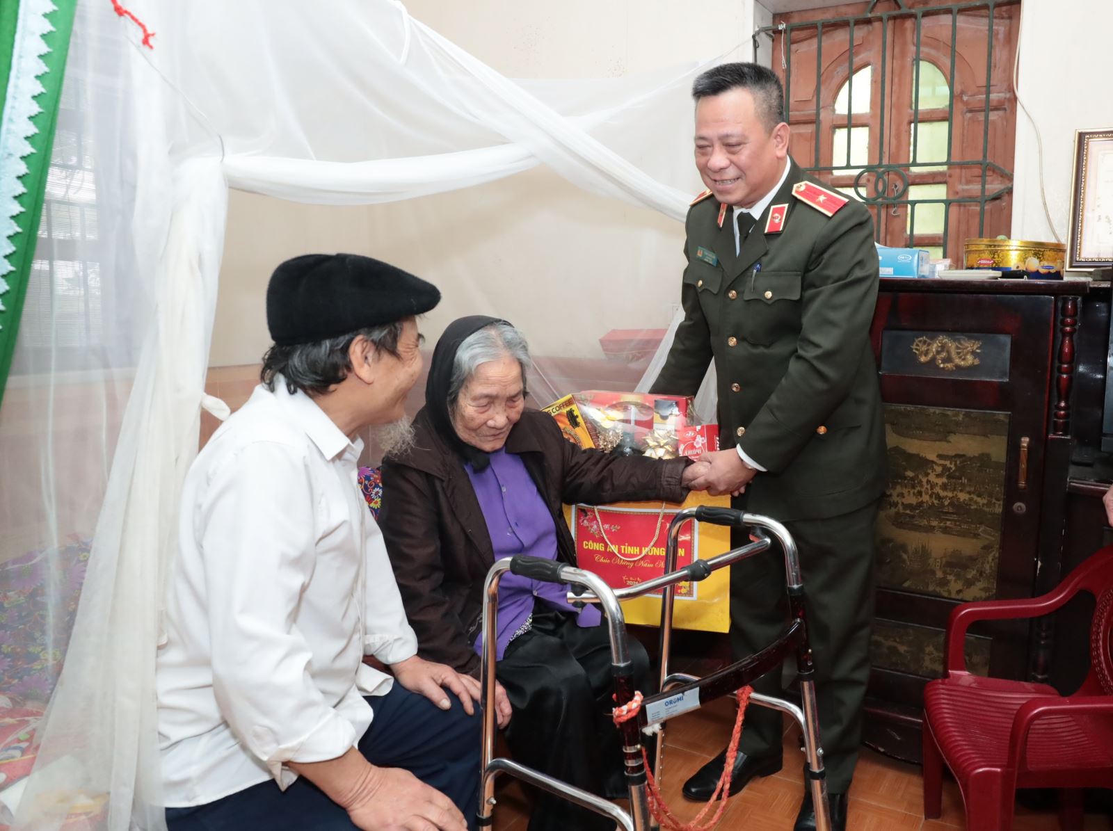 Thay mặt Đảng ủy, Lãnh đạo Công an tỉnh, đồng chí Giám đốc tặng quà Tết, kính chúc Mẹ Phạm Thị Sự luôn mạnh khỏe, đón xuân mới đầm ấm, an lành bên con cháu. Đồng chí mong muốn Mẹ Việt Nam anh hùng giữ gìn sức khỏe, tiếp tục là chỗ dựa tinh thần, tấm gương sáng để con cháu noi theo.