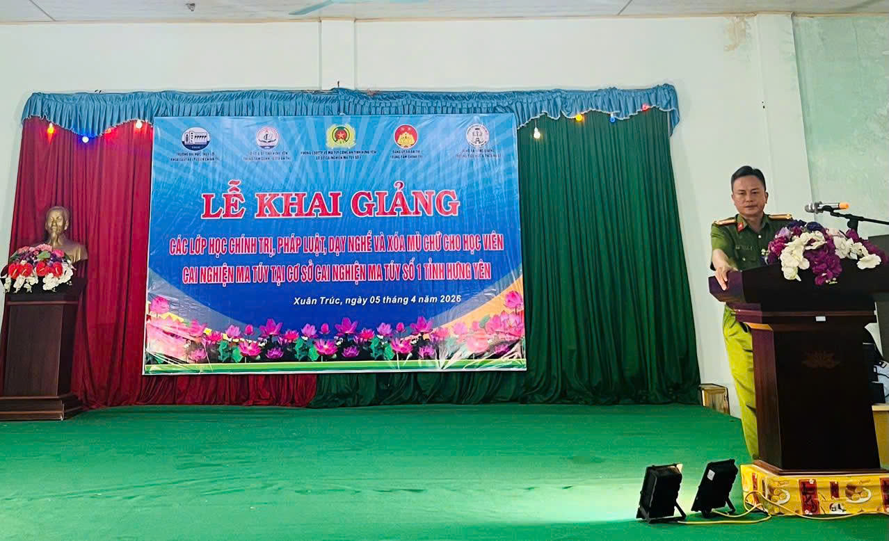 Sáng ngày 05/4/2026, Cơ sở cai nghiện ma túy số 1 thuộc Phòng Cảnh sát điều tra tội phạm về ma túy, Công an tỉnh Hưng Yên đã phối hợp với trường Đại học Thủy Lợi, Trung tâm GDTX - GDNN Ân Thi, Trung tâm Chính trị xã Ân Thi, Trường Tiểu học và THCS Hạ Lễ đã tổ chức Lễ khai giảng lớp học Chính trị, pháp luật, dạy nghề và xóa mù chữ dành cho học viên đang điều trị, cai nghiện tại Cơ sở.