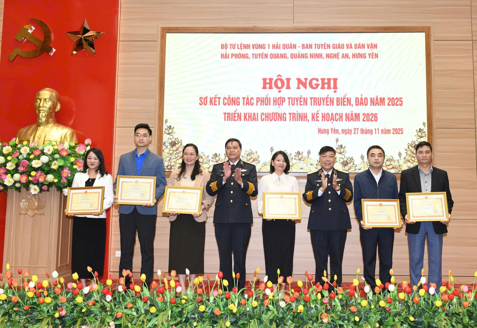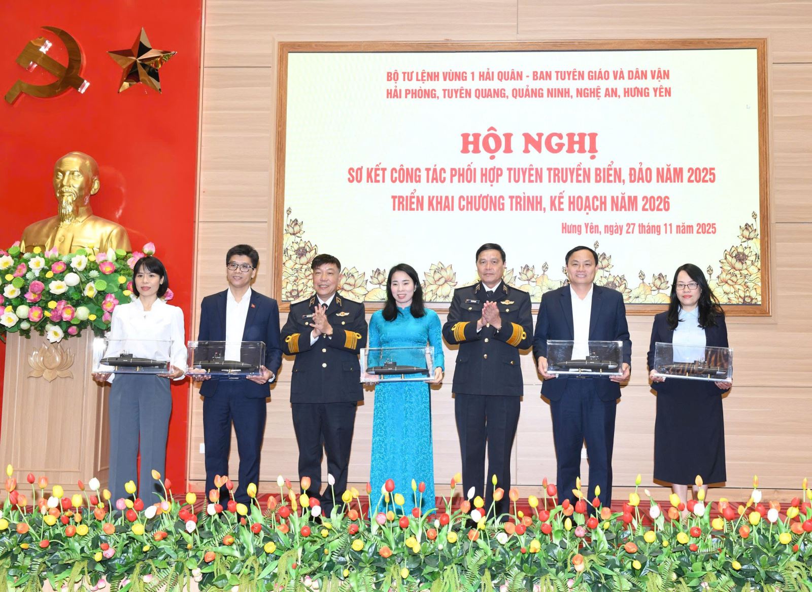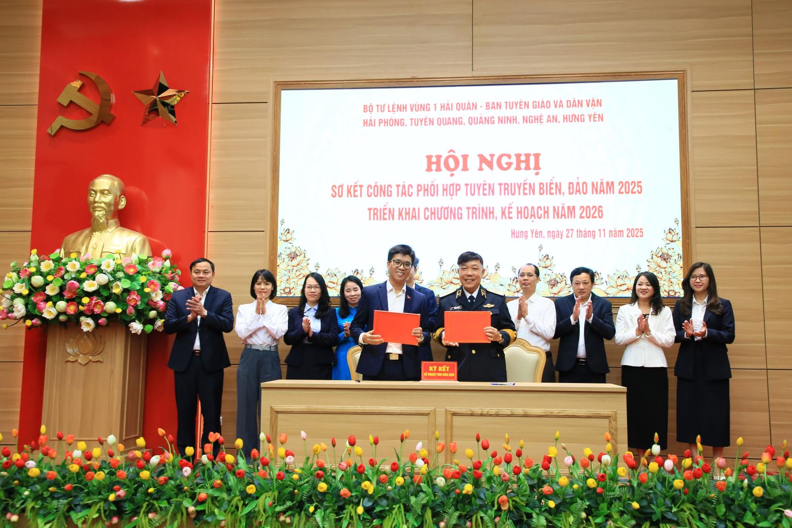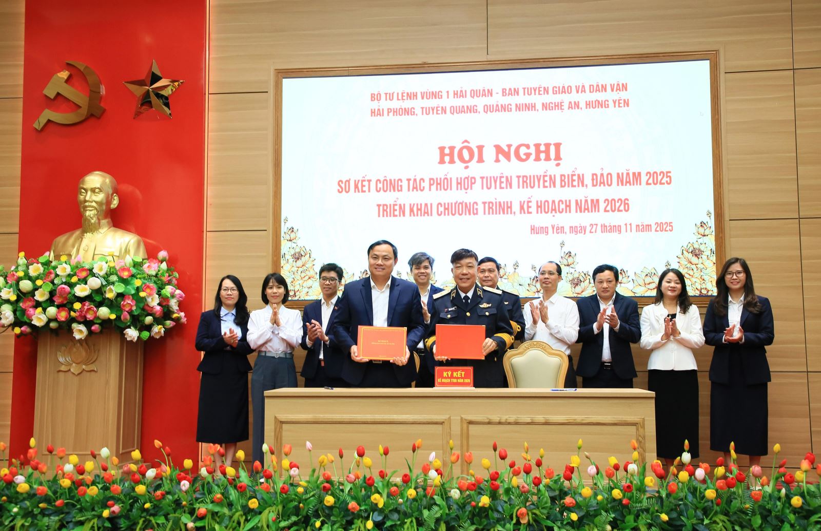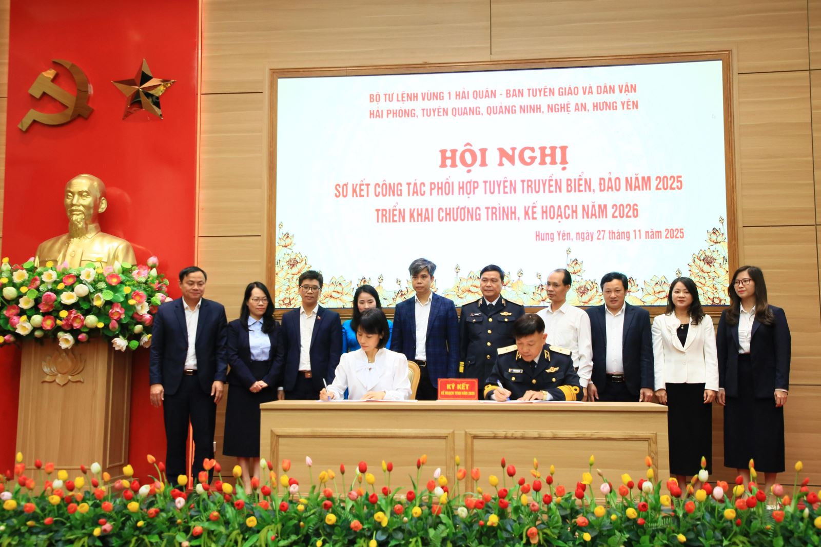 Sáng ngày 27/11, tại Trụ sở Tỉnh ủy, Bộ Tư lệnh Vùng 1 Hải quân phối hợp với Ban Tuyên giáo và Dân vận các tỉnh, thành phố: Hưng Yên, Tuyên Quang, Quảng Ninh, Nghệ An và Hải Phòng tổ chức hội nghị sơ kết công tác phối hợp tuyên truyền biển, đảo năm 2025 và ký kế hoạch phối hợp năm 2026.